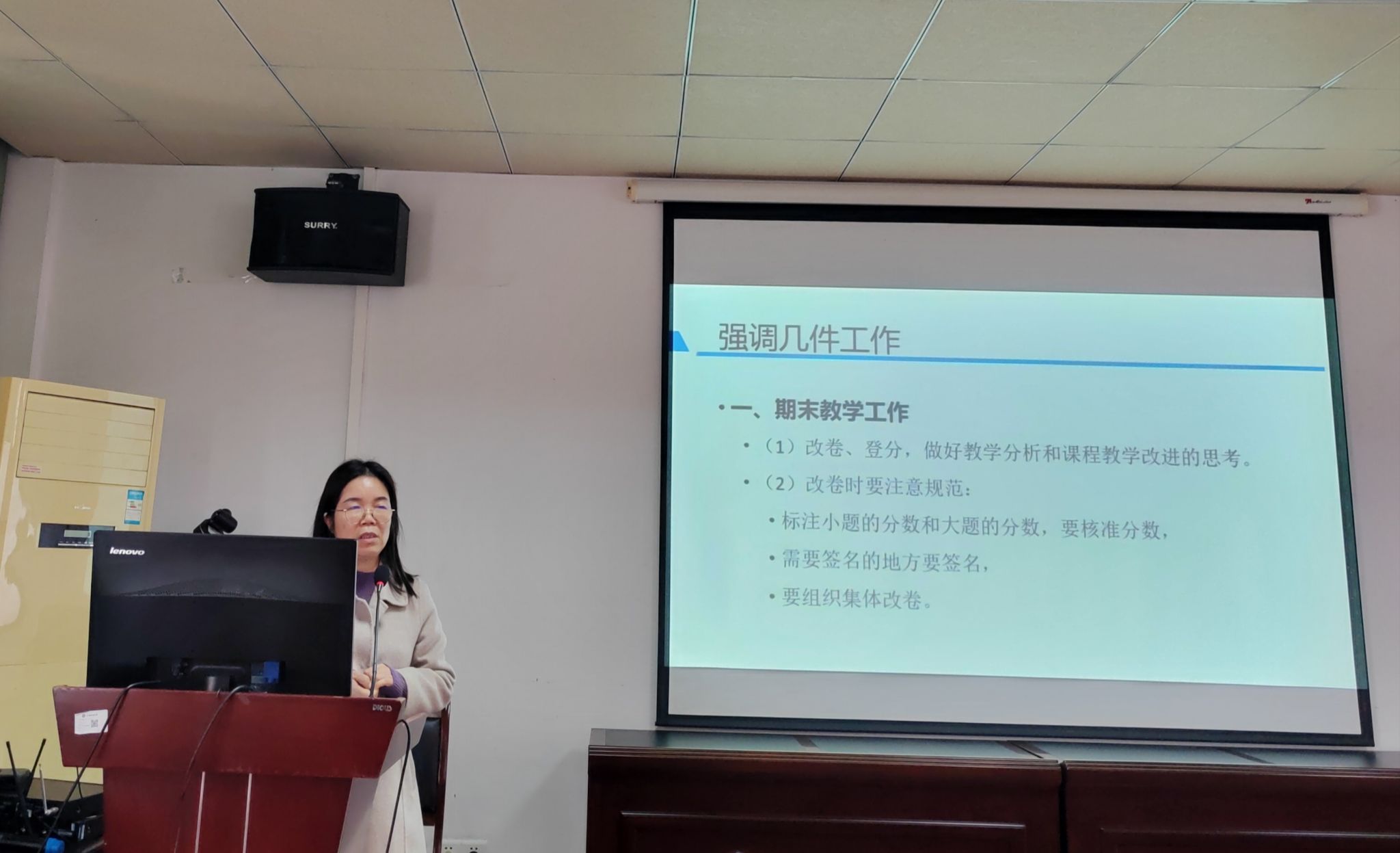 学院副院长莫靖林对寒假放假安排、实验室假期安全、国基申报等工作进行布置。学院副院长秦董洪对期末成绩录入、课程建设、毕业设计指导、本科教育教学审核评估相关事宜进行布置。