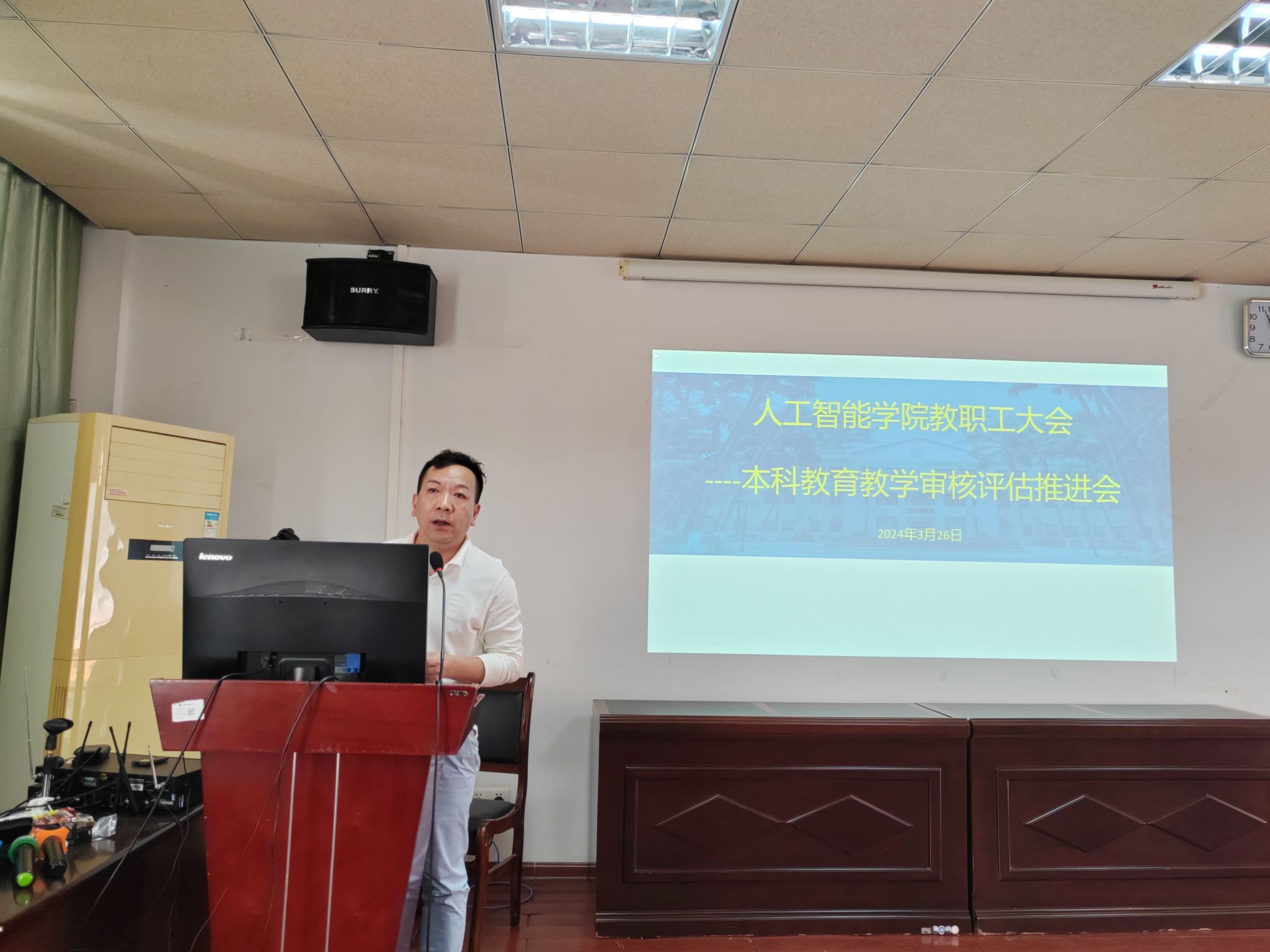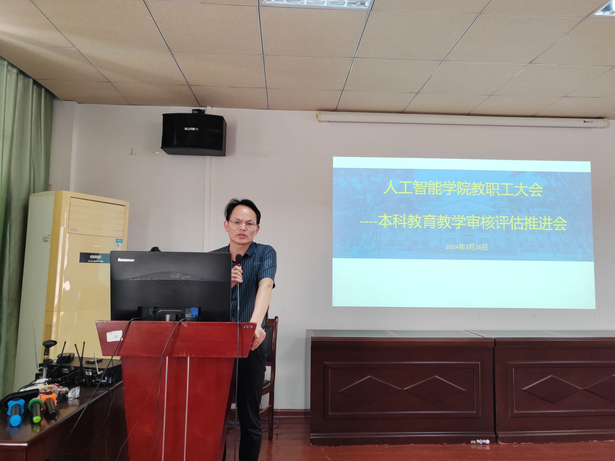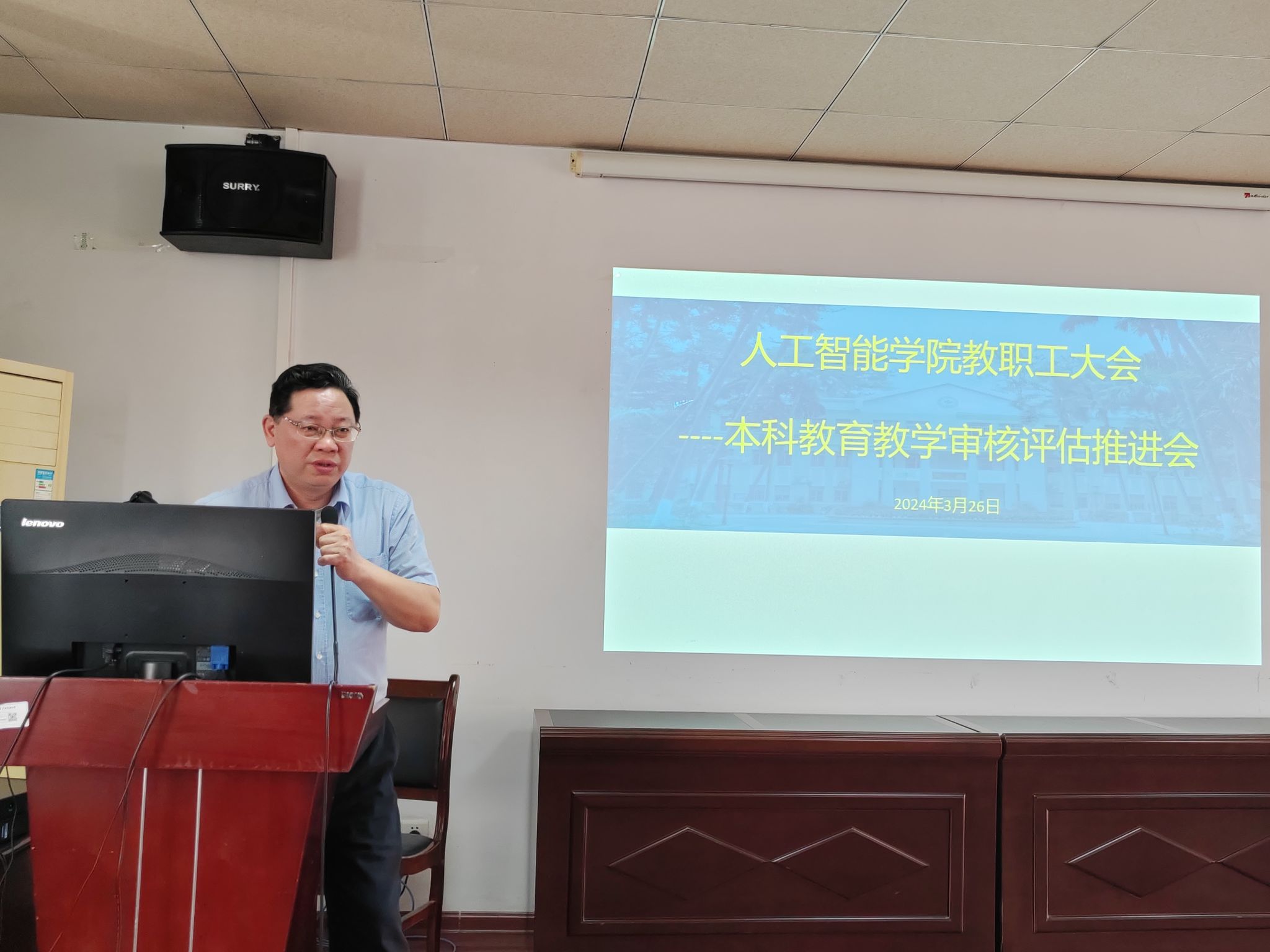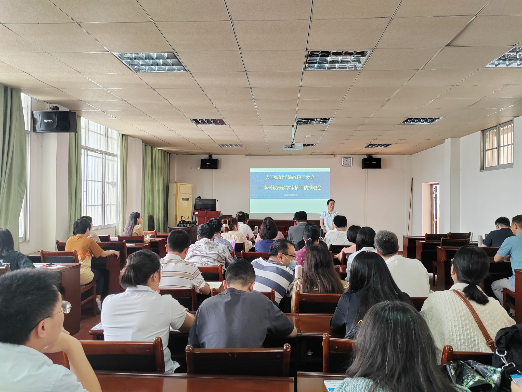3月26日下午,我院于博达楼418室召开全体教职工大会,院长葛丽娜对我院本科教育教学审核评估工作情况进行通报,并对近期要开展的工作进行布置。学院党委书记蔡其明要求全院教职员工要积极行动起来,真正做到以评促教、以评促改、以评估管、以评促强。