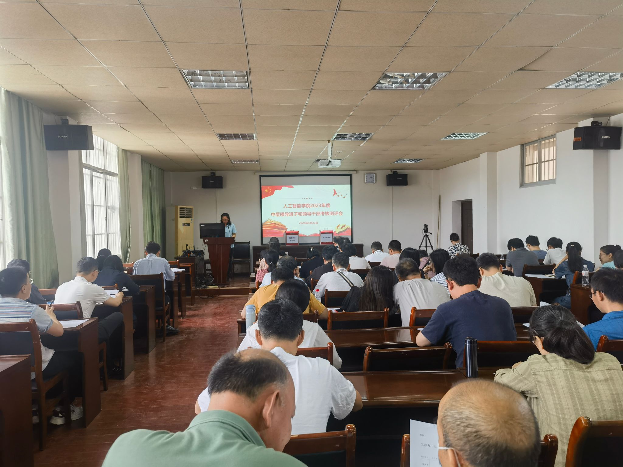 4月23日下午,我院在博达楼418室召开2023年中层领导班子和领导干部年度考核测评会。学校纪委纪检员李济权到会指导,学院党委书记蔡其明主持会议,全院教职工参会。