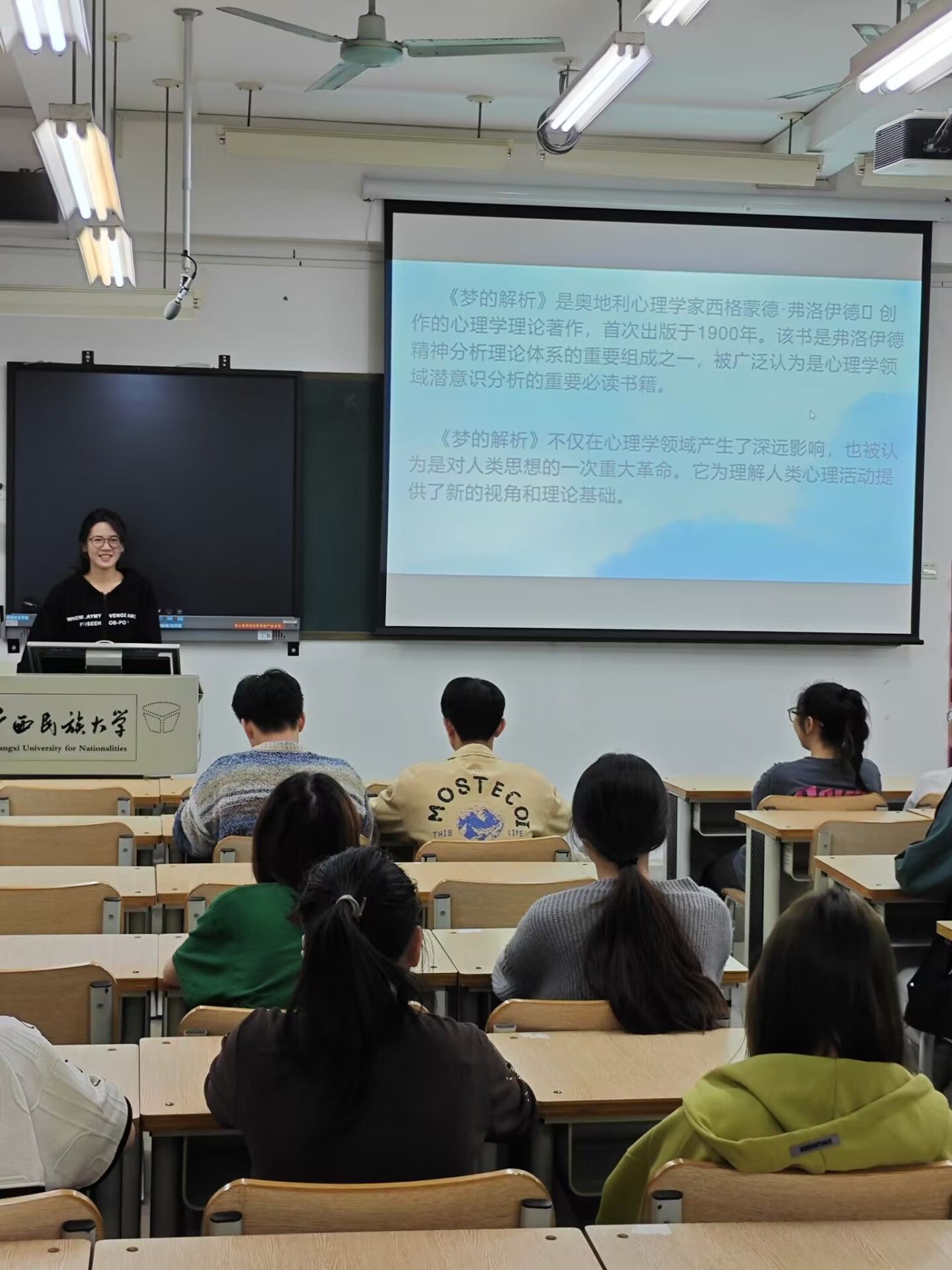 2021级软件工程1班俸小琳同学向大家介绍了《梦的解析》的基本信息:这本书是弗洛伊德心理学理论的重要组成部分,通过分析梦境来揭示人们内心深处的欲望和情感。俸小琳同学还分享了自己在阅读过程中的感悟,她表示,通过解析梦境,可以更好地了解自己的内心世界,从而更好地面对现实生活中的挑战。