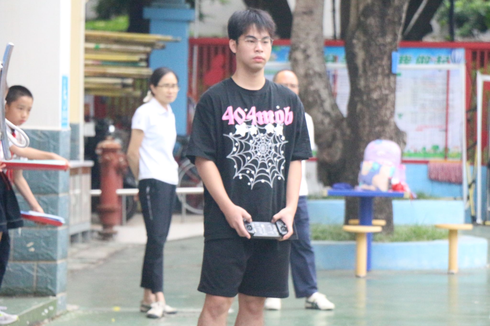 学生党员黄浩杰同学在教小朋友操作机器狗