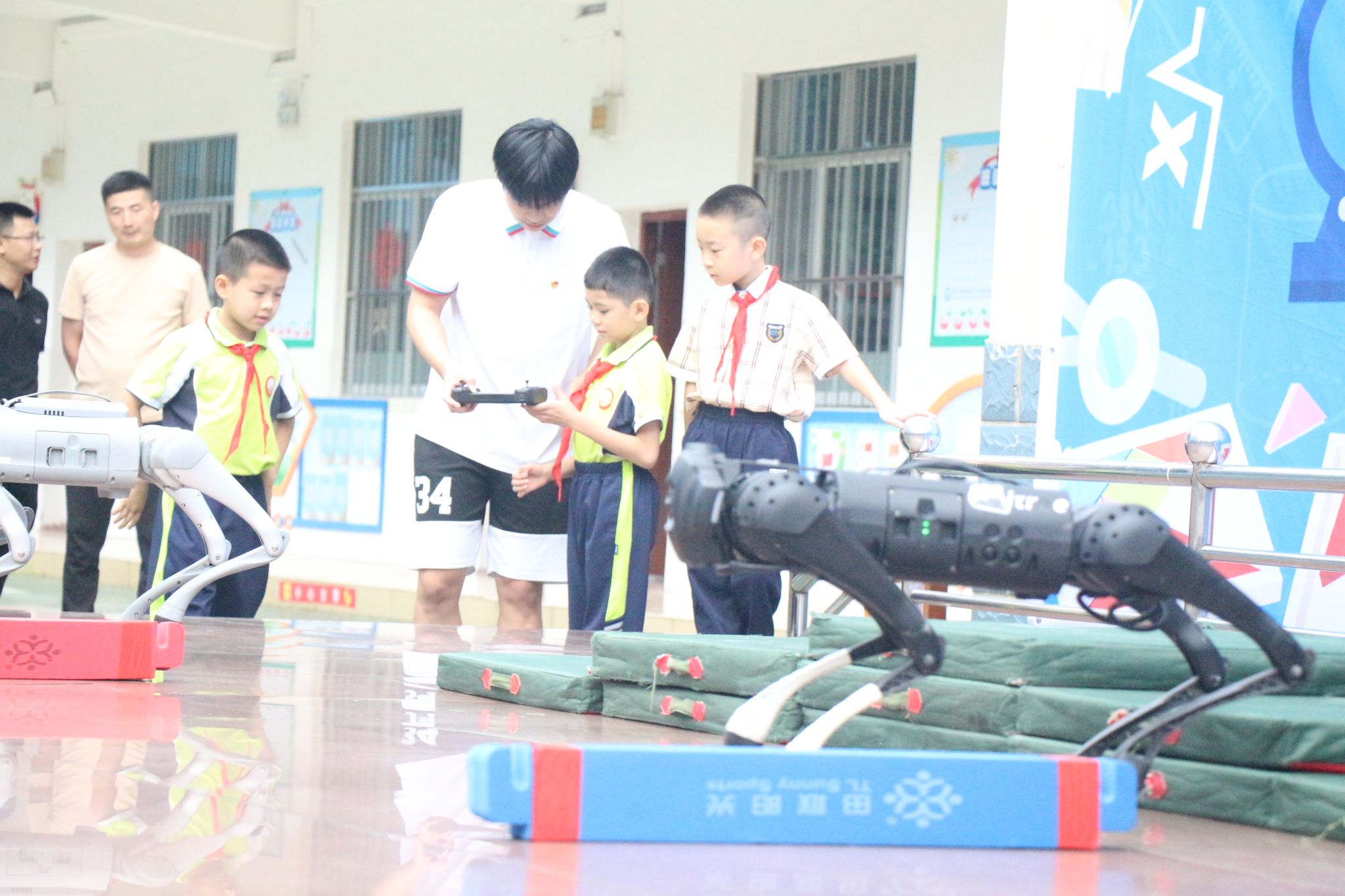 学生党员教小朋友操作机器狗