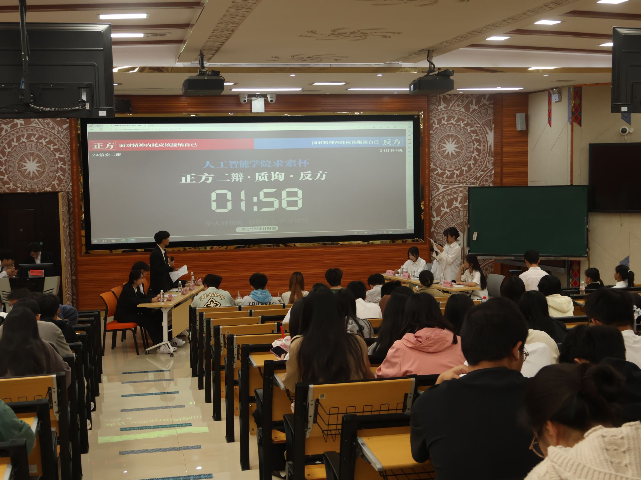 季军争夺赛围绕“面对精神内耗我们应该接纳自己还是鞭策自己”这一辩题展开。开篇立论环节,正反双方之间旁征博引,通过将理论与实践相结合,充分列举多个例子来论证本方观点。在自由辩论环节中,双方更是针锋相对,抓住突破口,或一针见血,或循循善诱,一次次将比赛推向高潮。赛场气氛紧张激烈,双方对手你来我往,侃侃而谈。