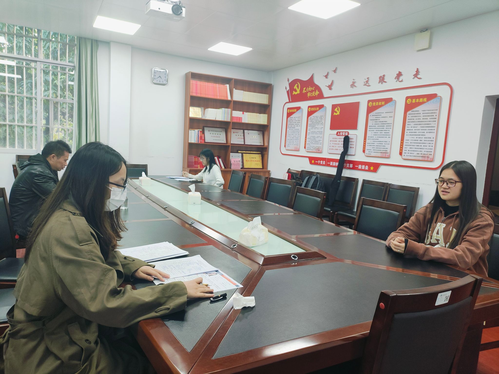 会后,广州欣彩电脑耗材有限公司副总经理范明和招聘专员陈玉媚在博达楼405室对投递简历的2025届毕业生进行了面试。(初审:韦晓萍 复审:孙寿媚 终审:蔡其明)