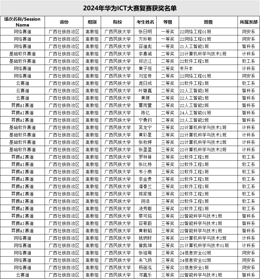 近日,第九届华为ICT大赛中国实践赛广西壮族自治区复赛的获奖名单公布。我院学子在比赛中表现优异,共有34位同学获奖,其中一等奖3人,二等奖10人,三等奖21人。