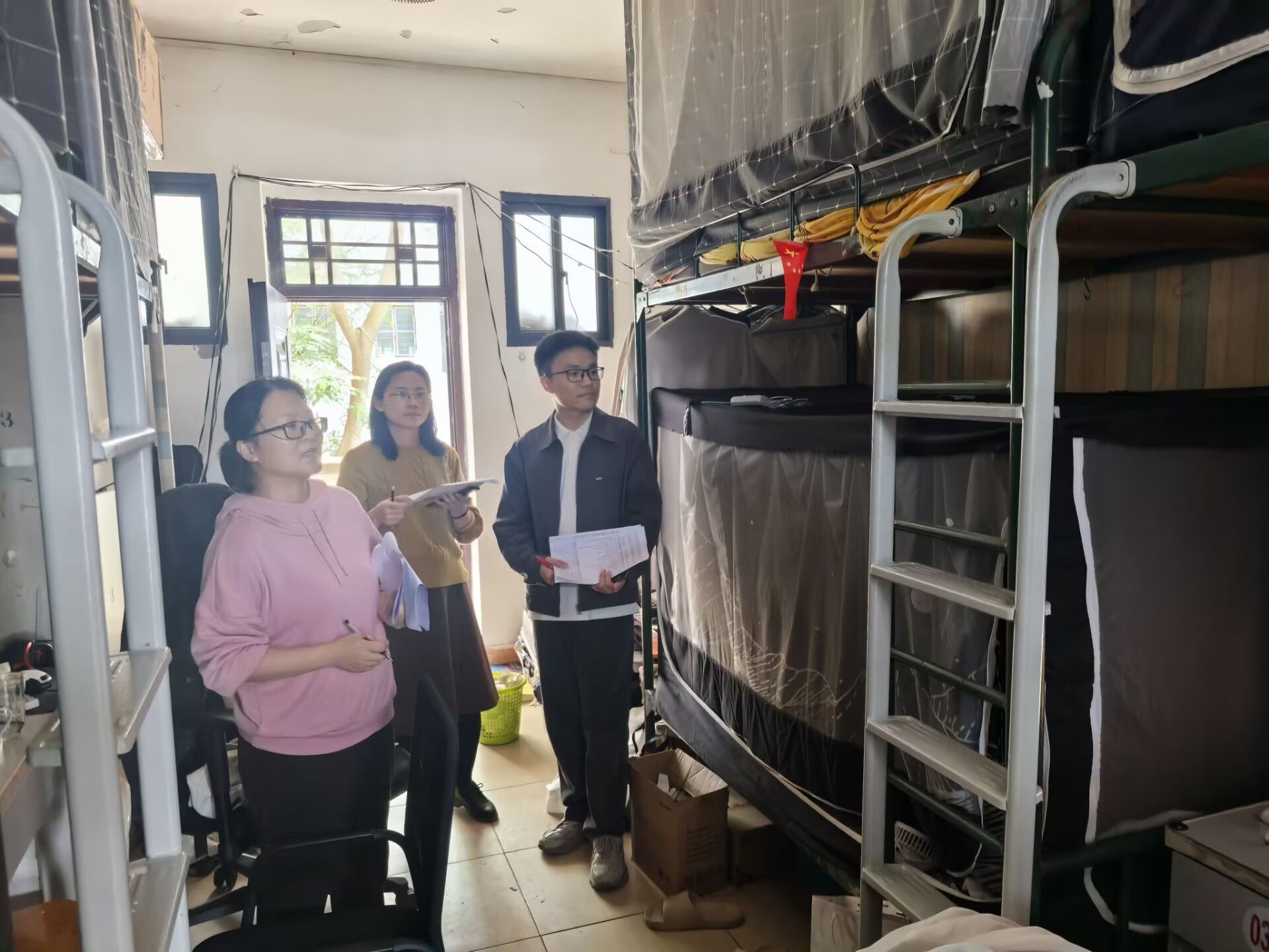 走访过程中,老师们对学生宿舍的用电安全、物品摆放、卫生状况等情况进行了详细检查,对检查过程中发现需要维修维护的设施,立即报修。