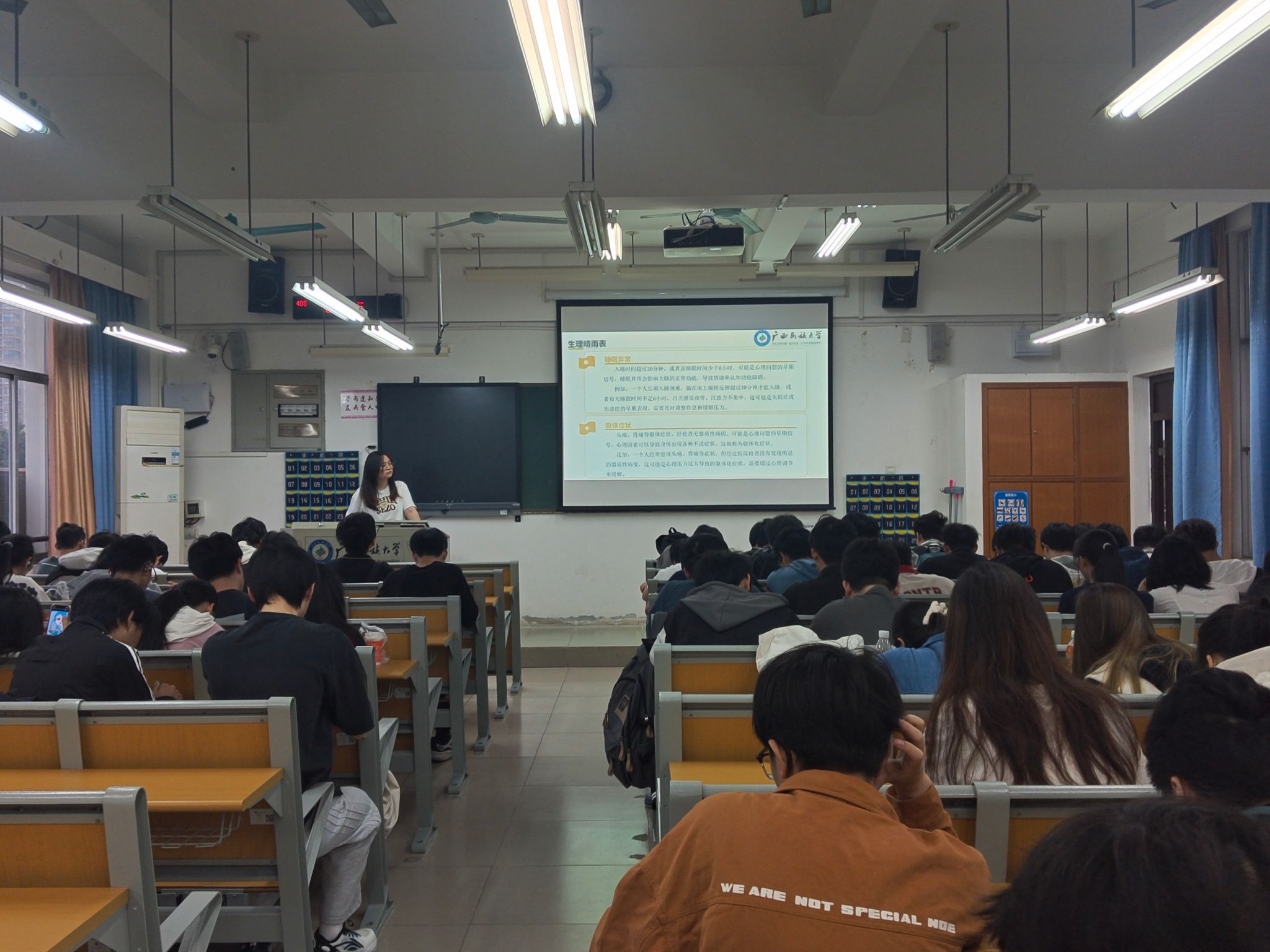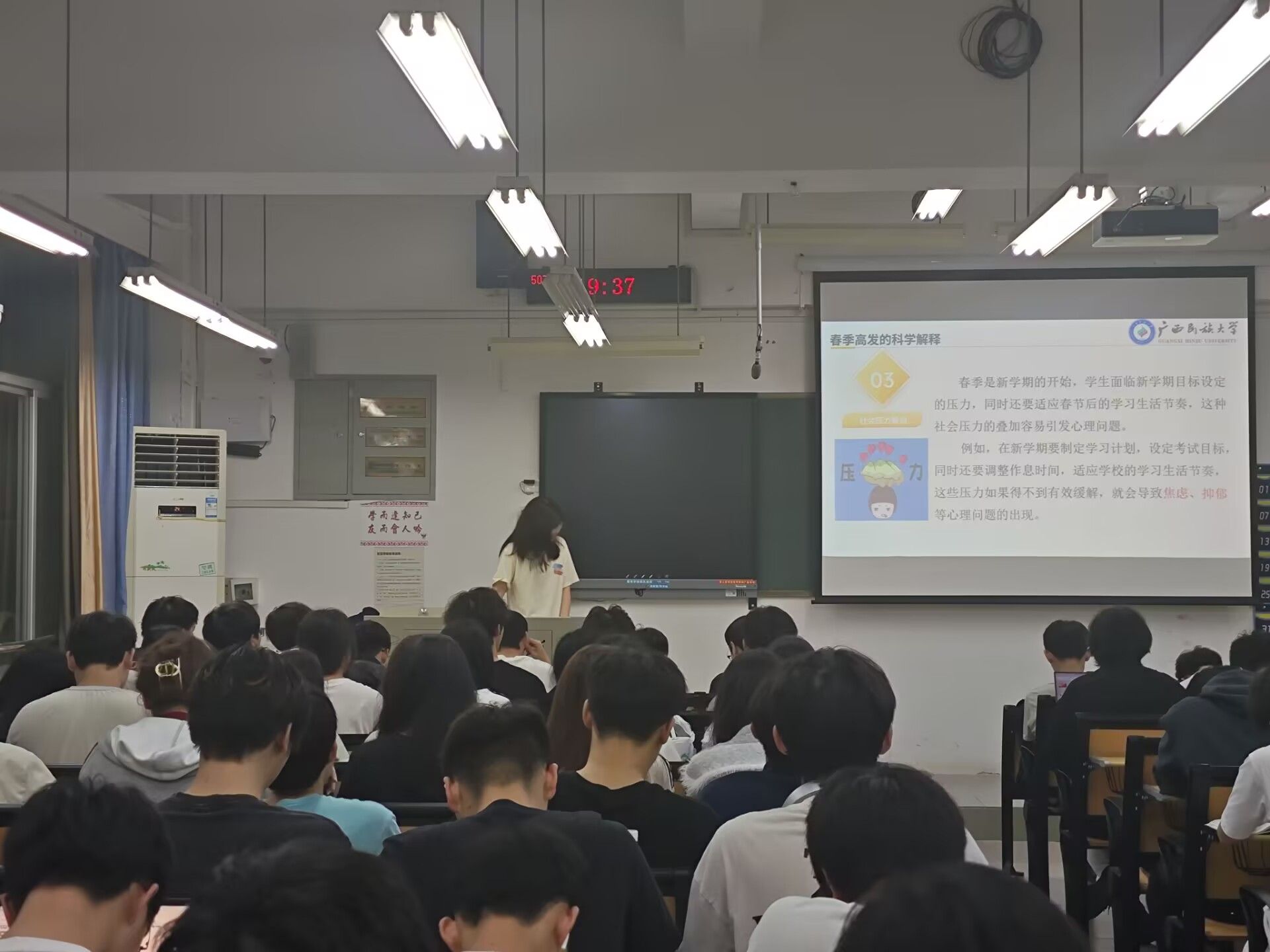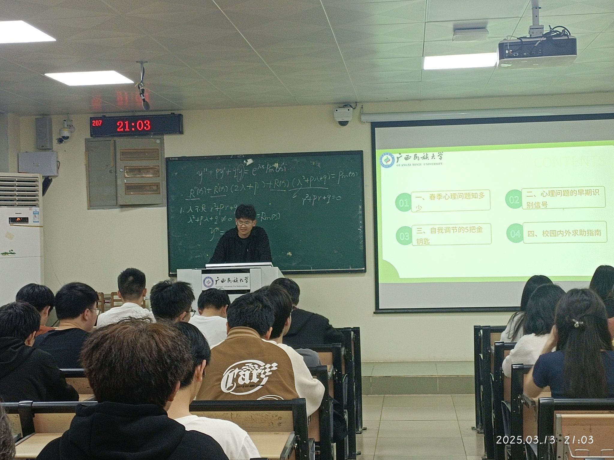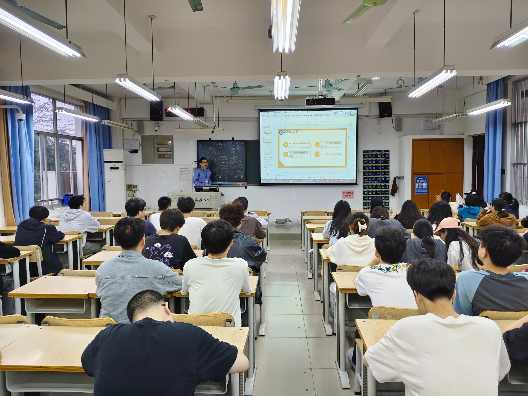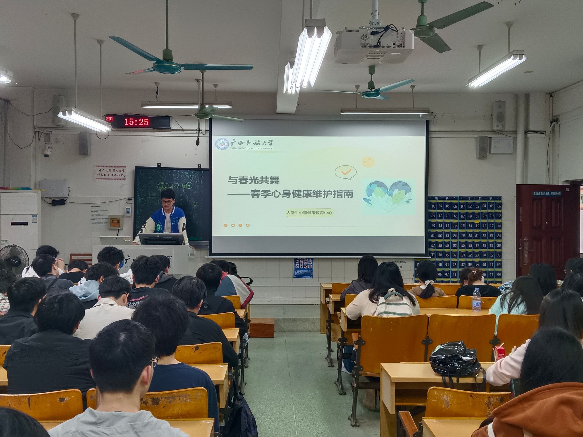 班会上,各班班主任、辅导员、心理委员围绕如下四个方面展开:一是介绍春季常见的心理问题类型及表现形式,并分析存在问题的具体原因。二是讲解典型的早期心理问题症状,教导同学们如何敏锐察觉自身的心理状态变化。三是分享多种实用的自我调节技巧,包括生物节律重建、运动处方、压力管理和艺术疗法等。四是介绍校内外的心理求助资源,鼓励同学们在遇到难以自行解决的心理问题时,及时寻求专业帮助。