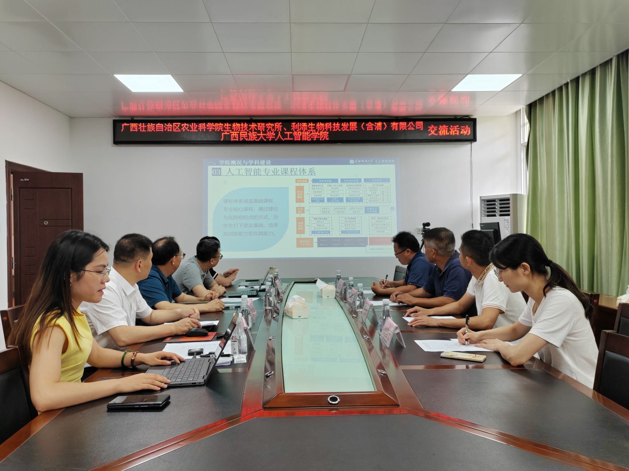 本次活动以“农业+AI技术交流”为主题。我院教师陆美曲详细介绍了学院概况、科研项目、校企合作及实验室建设等方面的内容。黄伟华副研究员、贤家旭常务副总经理就本单位基本情况和未来发展方向进行了阐述,并表达合作意向。文春明副院长则聚焦于企业实际需求和难题,针对性地进行技术指导。他表示,我院在农业与人工智能技术融合领域具备丰富的指导经验及扎实的合作基础,并以计算机视觉技术应用于甘蔗分选为例进行深入说明。在互动环节,双方围绕“人工智能与果蔬种植”进行热烈讨论,涉及知识图谱在土壤中的应用、农场中的云端操作、终端数据如何运用到实际中等议题。