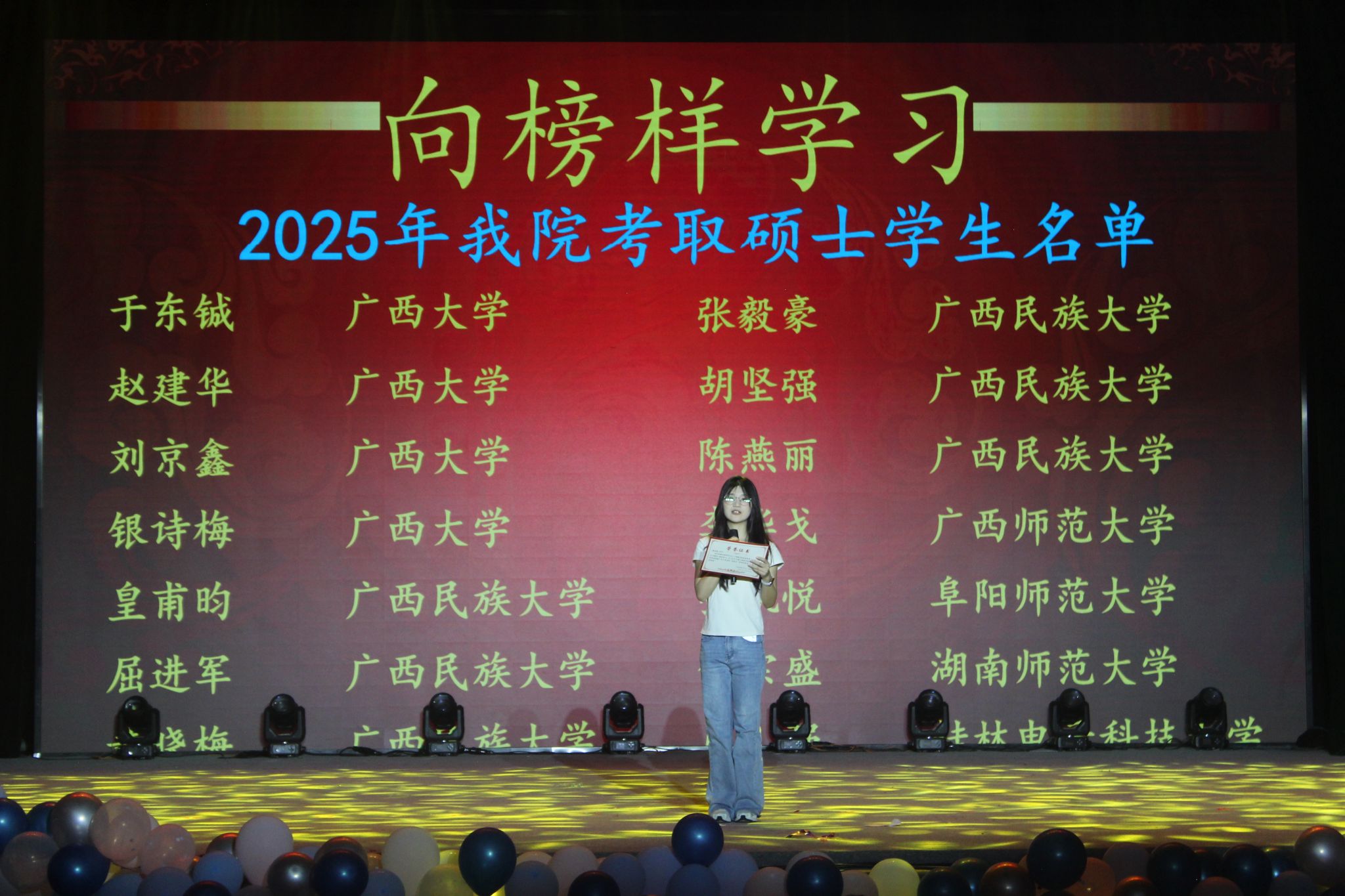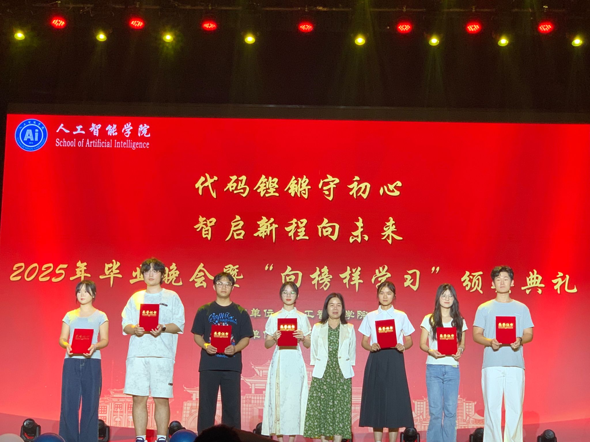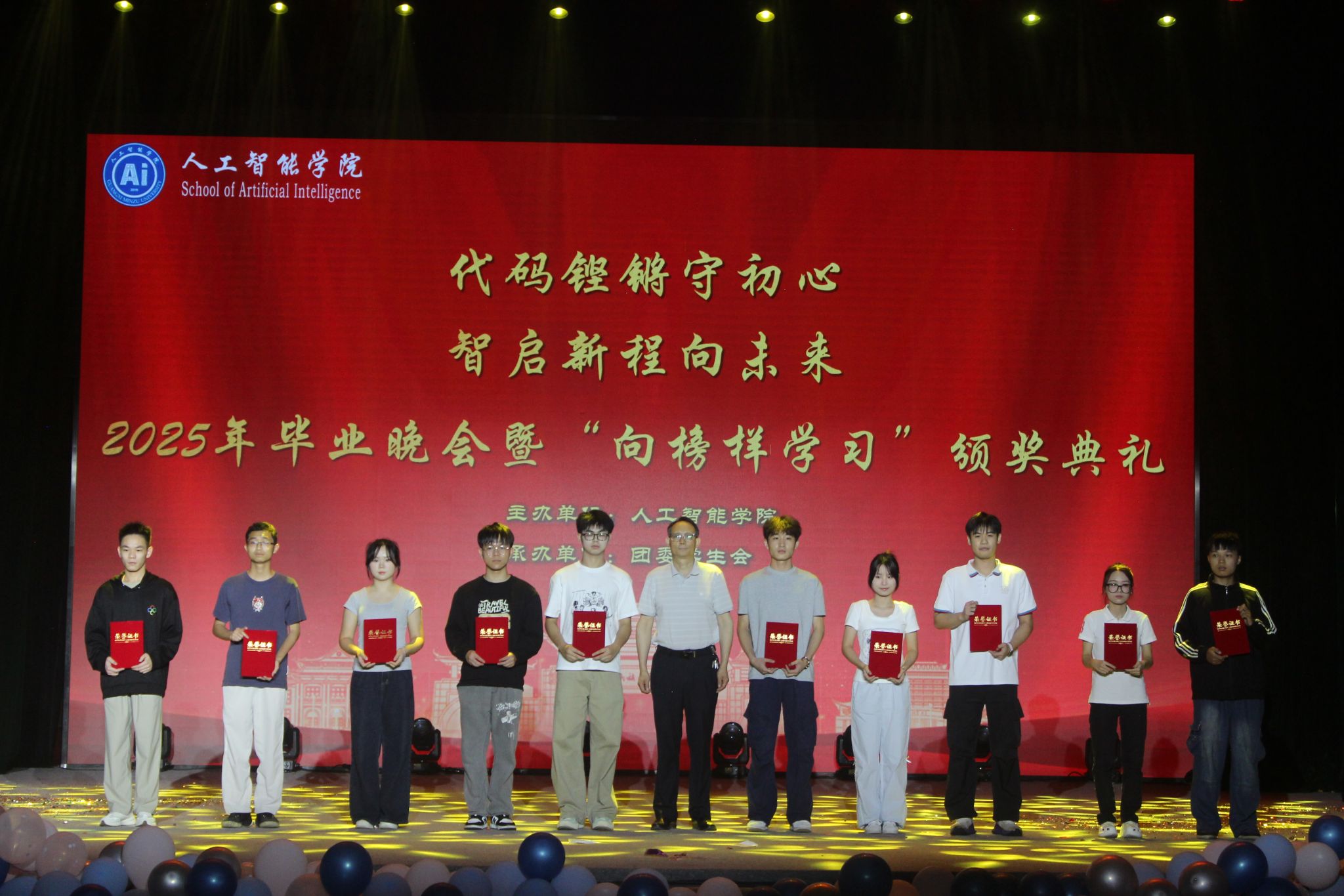 在精彩的节目表演间隙,“向榜样学习”颁奖环节成为了晚会的又一亮点。主持人依次宣读优秀学子名单,学院领导为他们颁发荣誉证书。这些优秀学子在学业、专业竞赛、学生干部工作等各个领域表现突出,用实际行动为学弟学妹们树立了优秀的榜样,他们的成就也激励着在场的每一位同学努力奋进。