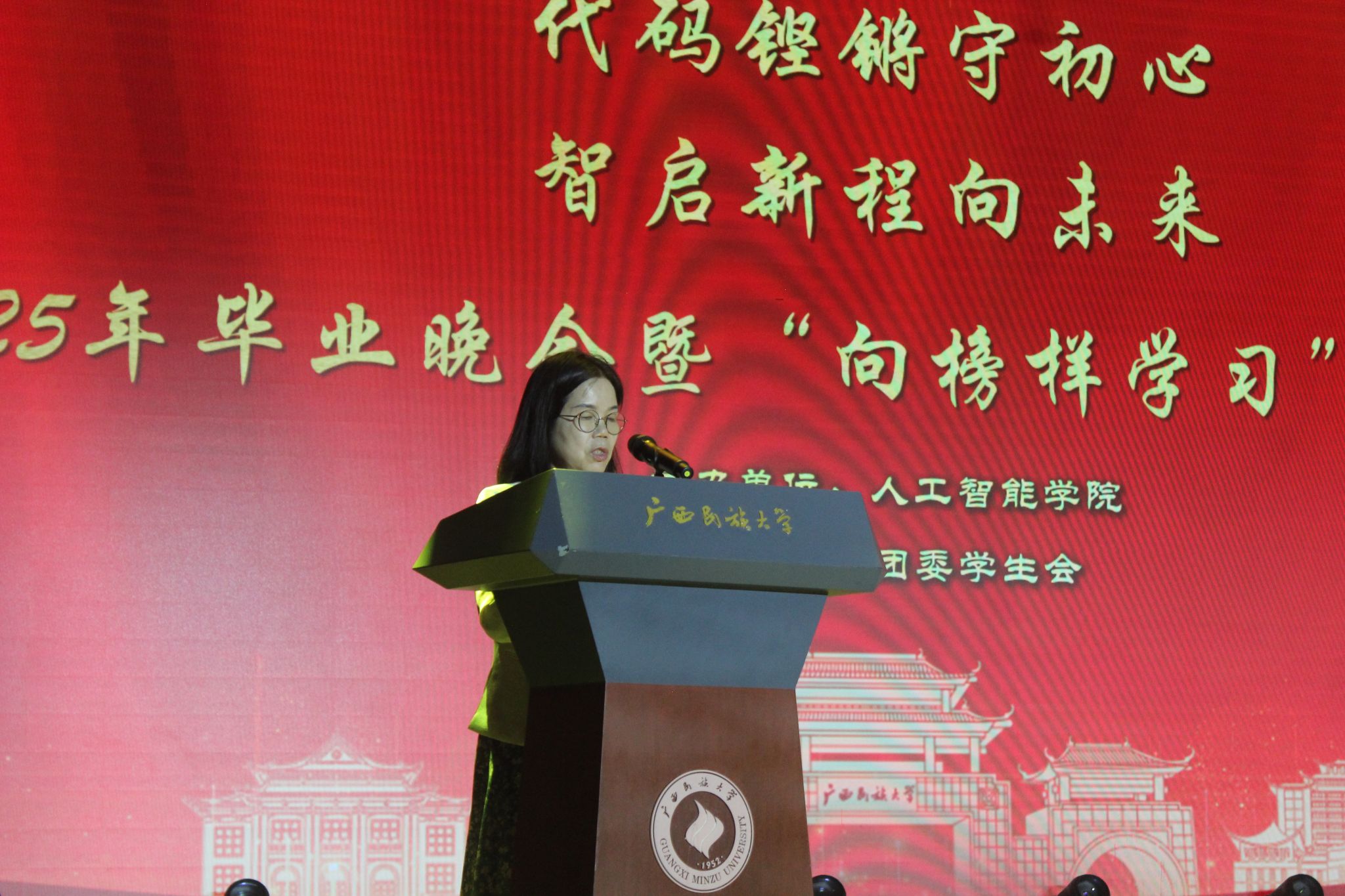 院长葛丽娜为晚会致辞。她用真挚朴实的话语,向毕业生们表达了殷切的期望与美好的祝福,字里行间满是对学子们的关怀与鼓励,激励着毕业生们在未来勇敢追逐梦想,在新的人生阶段绽放光彩。