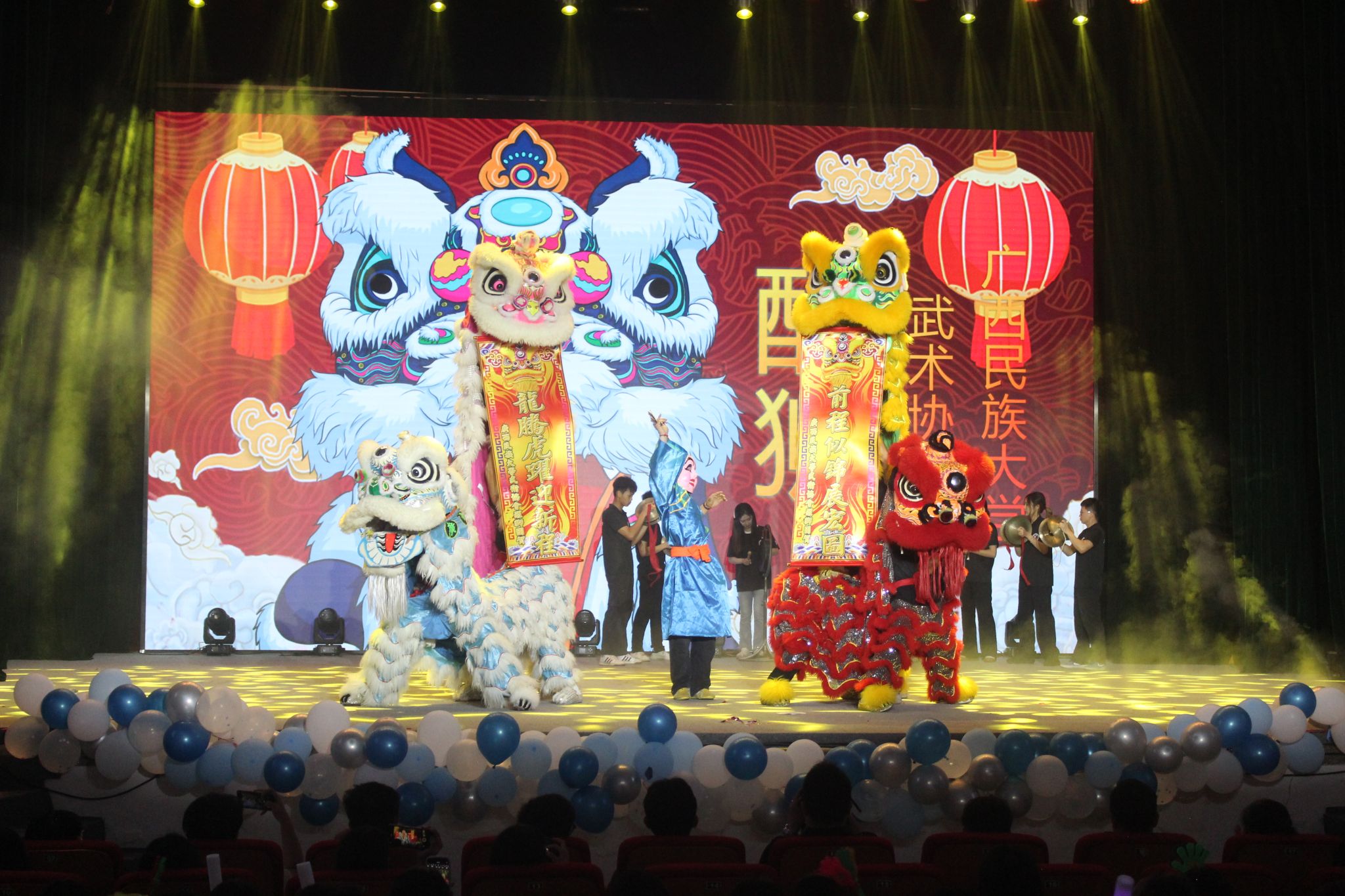 精彩绝伦的节目表演正式开启。舞台上,活力四射的舞狮表演威风凛凛,尽显传统文化的魅力;机器人表演以其科技感十足的动作和灵动的展示,瞬间点燃了现场气氛;优美的舞蹈舞姿翩跹,舞者们用肢体语言诉说着青春的故事;时尚走秀步伐自信,展现出学子们独特的魅力;震撼人心的军功表演英姿飒爽,赢得了观众们一阵又一阵热烈的掌声。