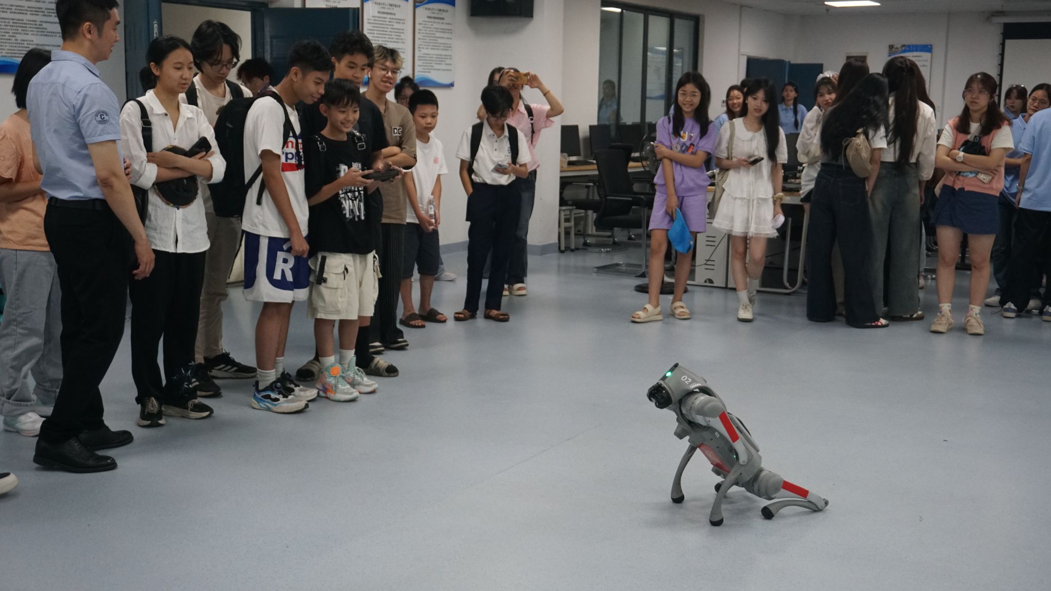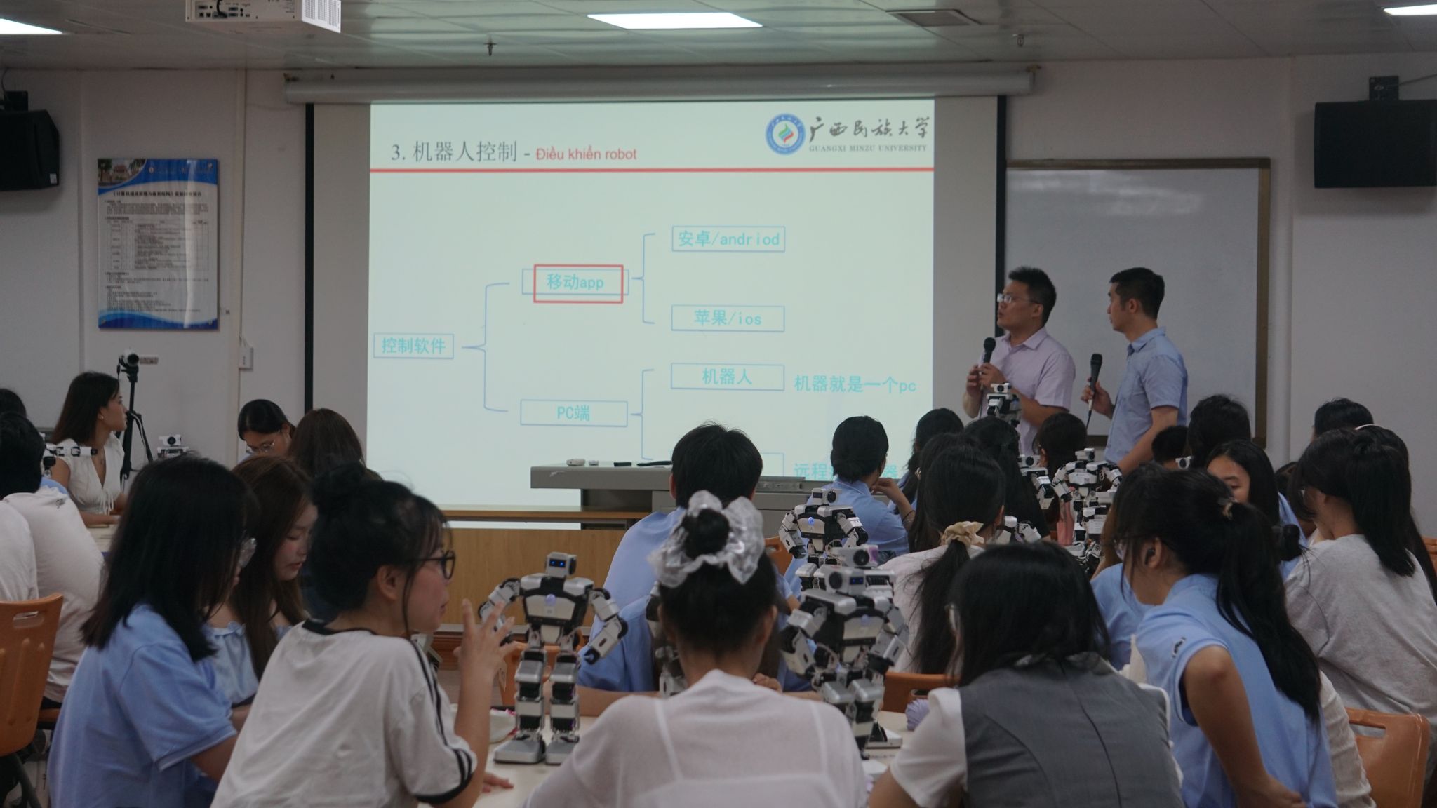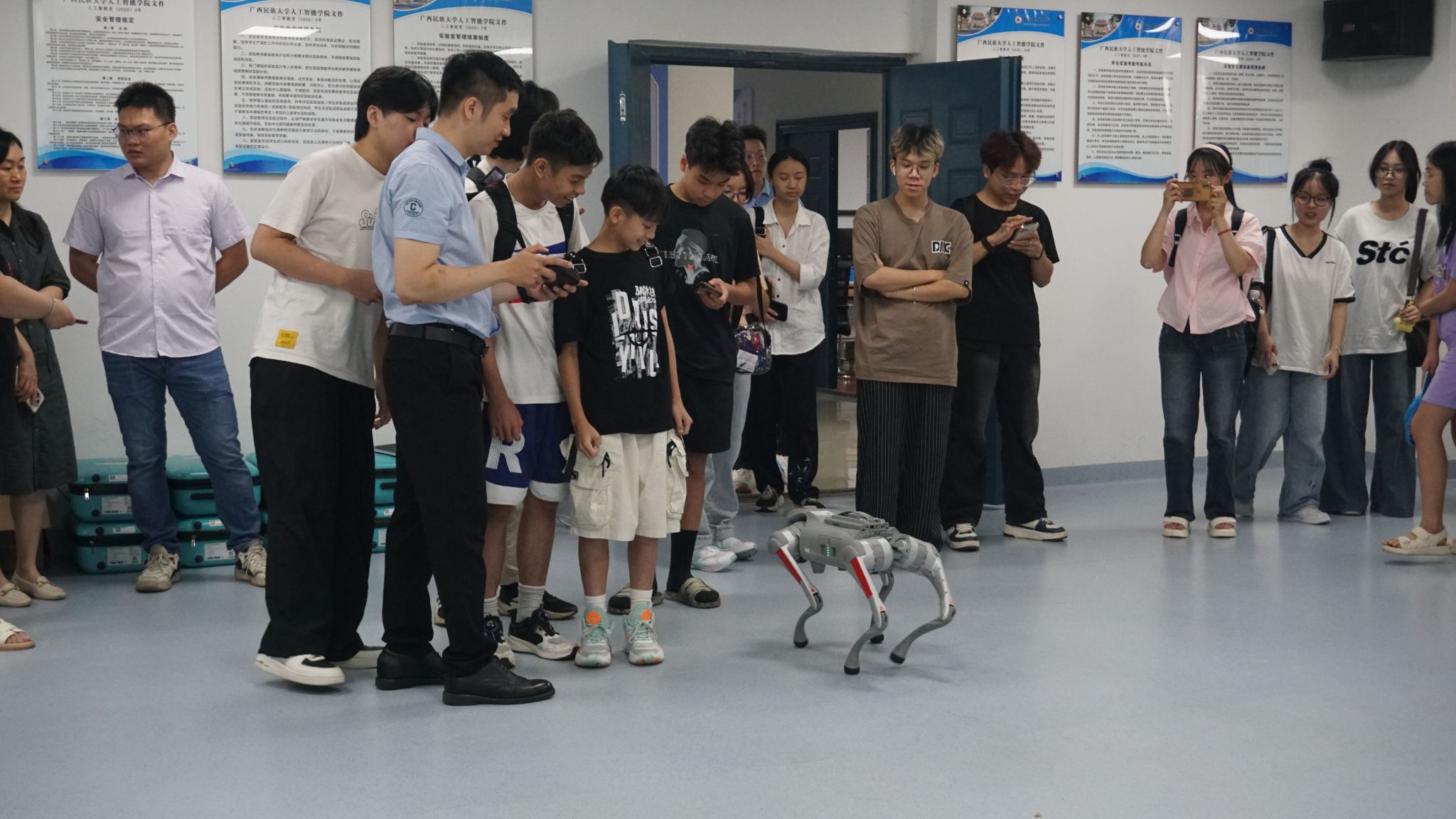 6月22日,我院教师郭泉博士率先带来《人工智能的影响与未来趋势》前沿科技讲座,以生动案例与详实数据,深入浅出地剖析人工智能发展脉络,引得越南青年代表频频提问,现场互动热烈。黄华娟等10位教师与中越青年围坐一堂,开展圆桌交流会。6月24日,李承云博士负责的“人形机器人结构分析与舞蹈控制”团队实践项目,将活动推向高潮。中越青年共同参观体验了机器人、机器狗等前沿人工智能产品,亲手操作、亲眼见证科技的神奇,惊叹声与欢笑声此起彼伏。