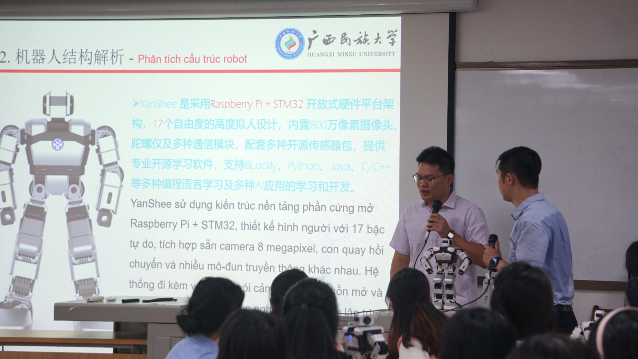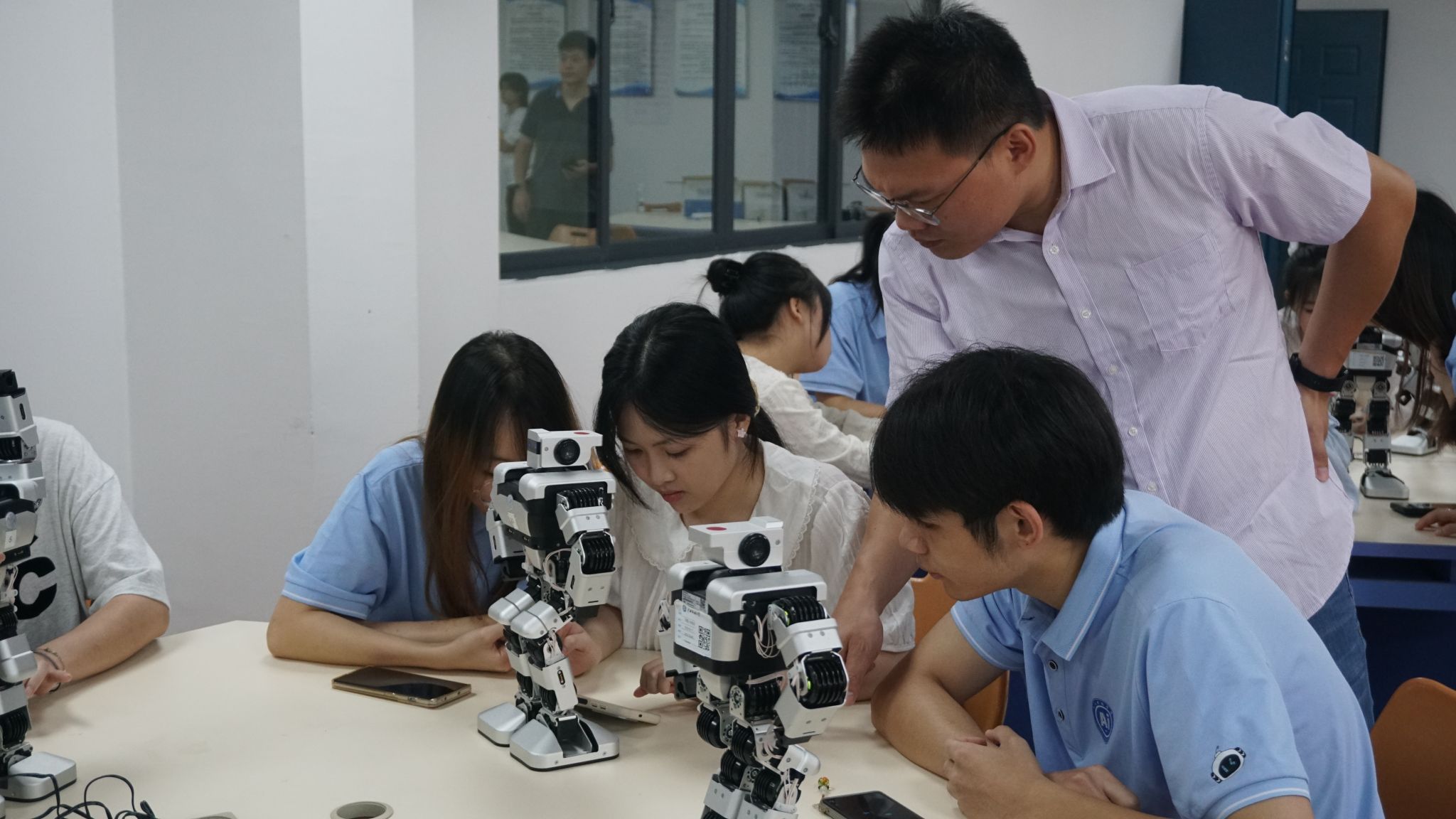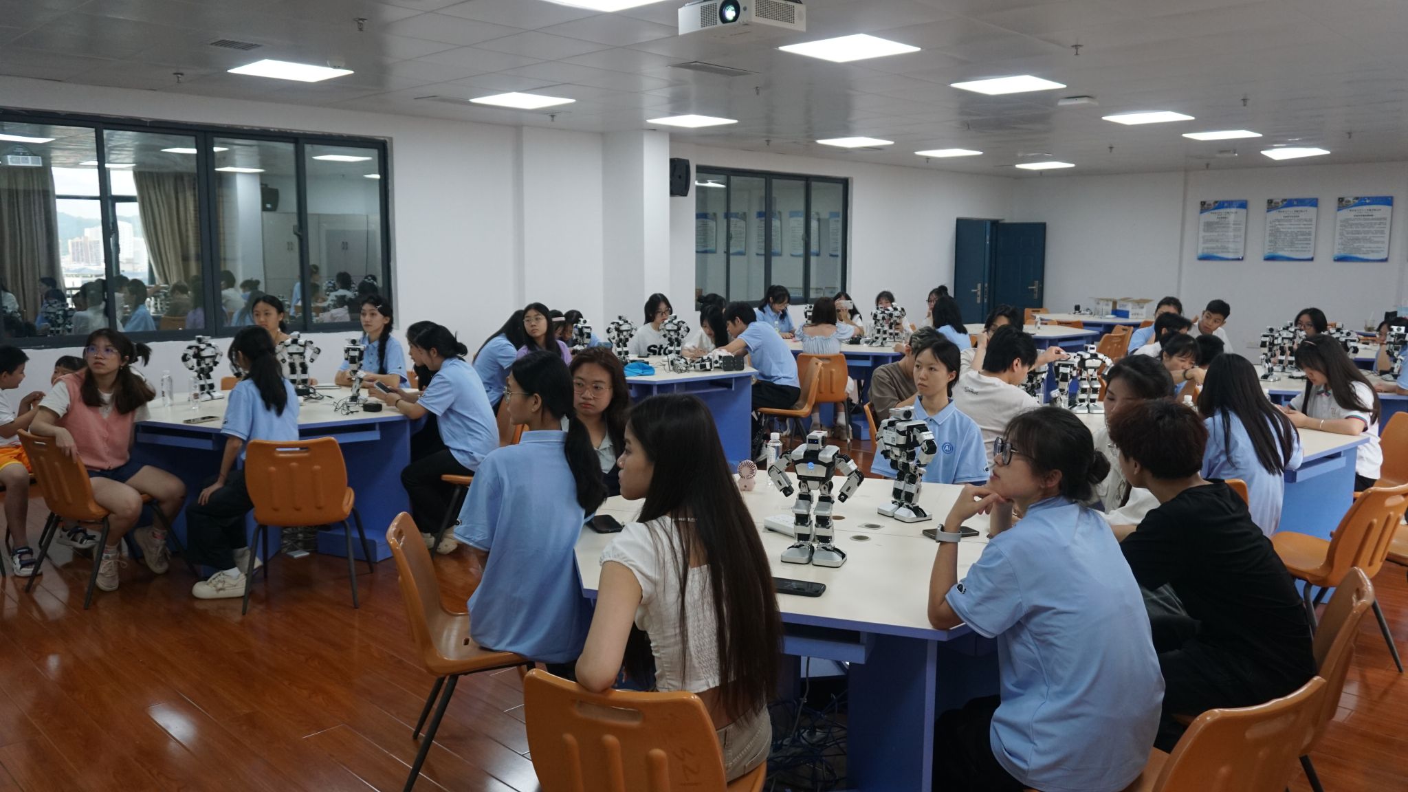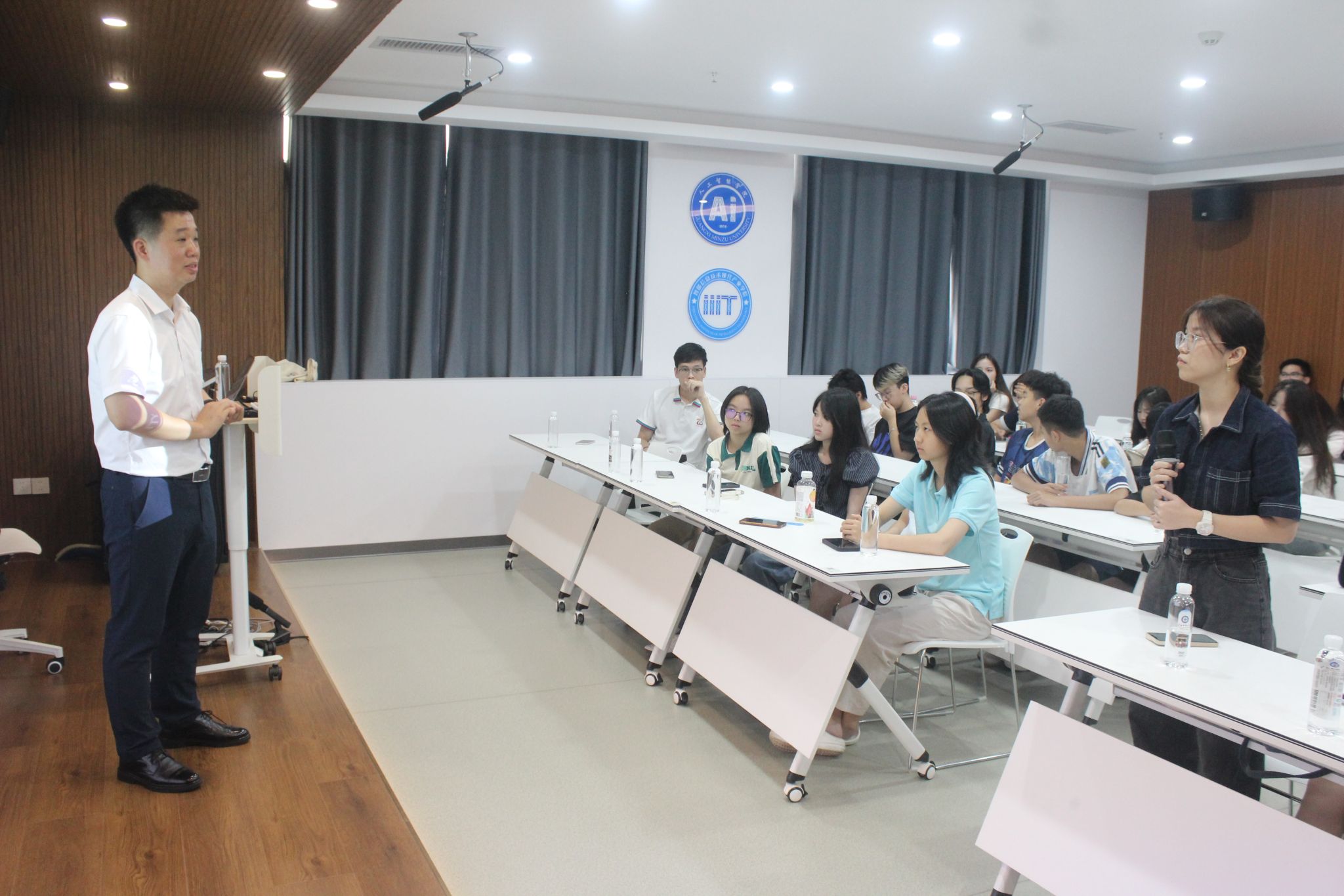 6月22日,我院教师郭泉博士率先带来《人工智能的影响与未来趋势》前沿科技讲座,以生动案例与详实数据,深入浅出地剖析人工智能发展脉络,引得越南青年代表频频提问,现场互动热烈。黄华娟等10位教师与中越青年围坐一堂,开展圆桌交流会。6月24日,李承云博士负责的“人形机器人结构分析与舞蹈控制”团队实践项目,将活动推向高潮。中越青年共同参观体验了机器人、机器狗等前沿人工智能产品,亲手操作、亲眼见证科技的神奇,惊叹声与欢笑声此起彼伏。