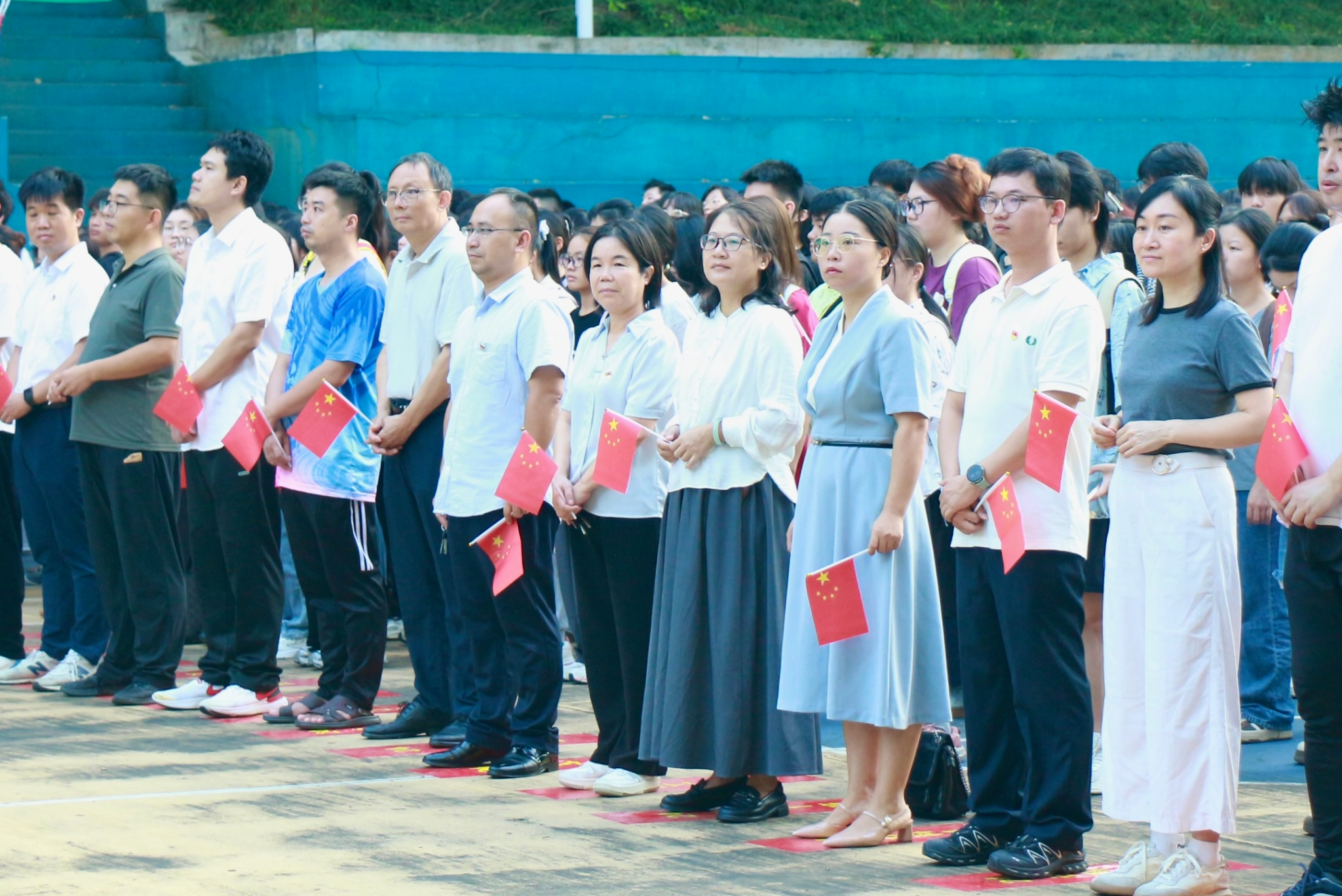 仪式在庄严肃穆的氛围中拉开帷幕。护旗手迈着铿锵有力的步伐,护送五星红旗行进至旗杆下。师生们整齐列队,面向国旗肃立行注目礼,齐声高唱国歌。冉冉升起的红旗与激昂的旋律交织,点燃了在场每个人的爱国情怀。