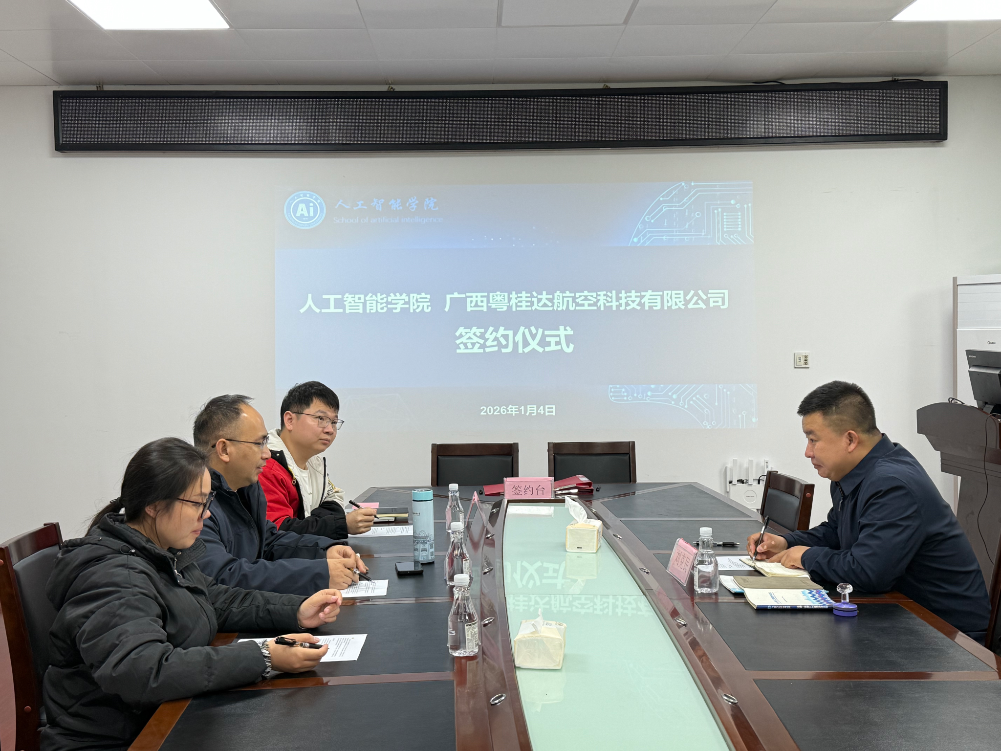 广西粤桂达航空科技有限公司负责人刘克民详细介绍了公司发展概况与核心业务范围。学院党委书记刘志雄就学院的发展情况进行介绍,并表达与企业在人才联合培养、科研项目攻关、赛事协同培育等方面开展合作,为企业发展输送优质人才,为区域航空科技产业高质量发展贡献力量。谢和坤老师针对AI研究的一些领域、李清老师针对实习领域分别与公司负责人进行了探讨。随后,双方就共建校外实践教育基地进行了签约,助力推动人才培养与产业发展深度融合。