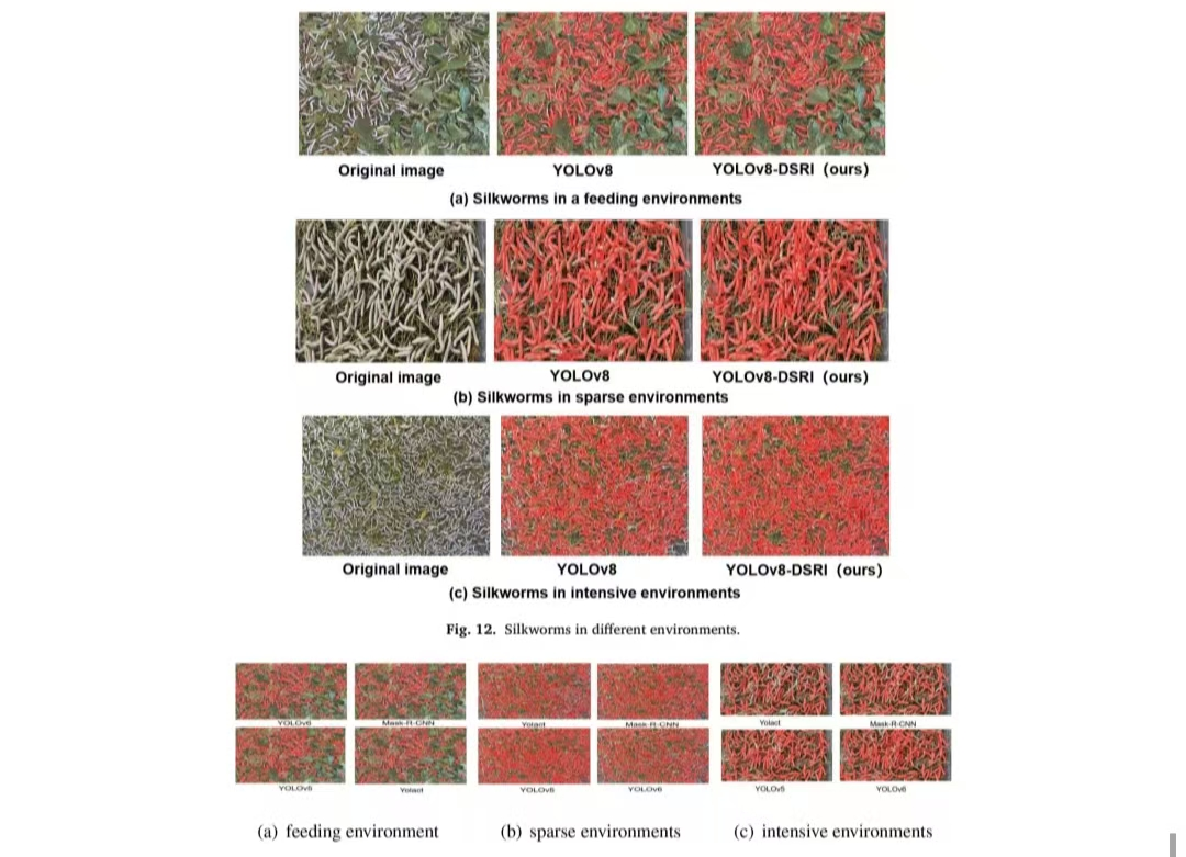 在传统蚕业养殖中,蚕体分布密集、相互遮挡,人工计数的方式效率较低。针对此问题,本研究提出了一种密集目标实例分割算法YOLOv8-DSRI,通过引入扩张残差模块、大分离核注意力机制、感受野注意力卷积以及更高效的损失函数,有效提升了模型在复杂密集场景下对蚕体目标的识别精度与鲁棒性,同时保持了模型的轻量化特性。相关算法不仅可用于智慧蚕业,也为鱼苗、蔬果计数等农业场景下的密集生物检测提供了可借鉴的方案。