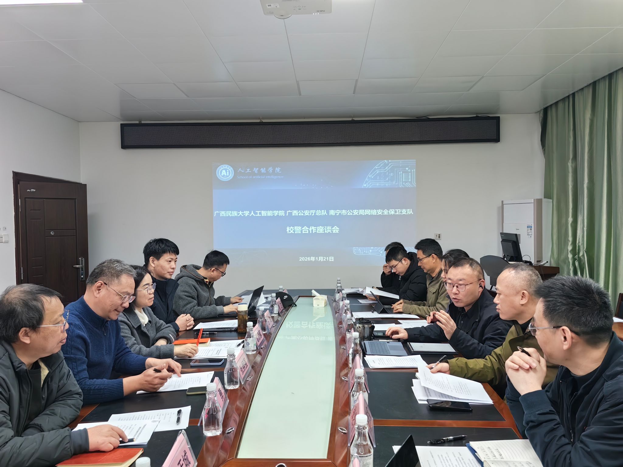 会上,葛丽娜院长介绍了学院在人工智能、网络安全等领域的学科建设、科研攻关及人才优势,强调此次合作是学院服务广西数字经济发展的重要举措,期待与公安部门携手实现优势互补、资源共享。自治区公安厅五支队支队长陈兴文、南宁市公安局网安支队政委陈林分别介绍了公安实战需求,指出当前网络安全形势对专业技术和人才的迫切需求,希望依托高校优势破解技术难题,吸纳优质专业人才。双方还围绕“深化校警合作,共筑网络安全与人工智能融合发展”的主题展开深入交流探讨,就人才共育、科研攻关、技术协同等合作方向达成共识,明确共建实训基地、联合组建科研团队、深化技术协同应用等合作内容,同时还就党建联建、“双师型”教师队伍建设等相关事宜展开深入磋商。