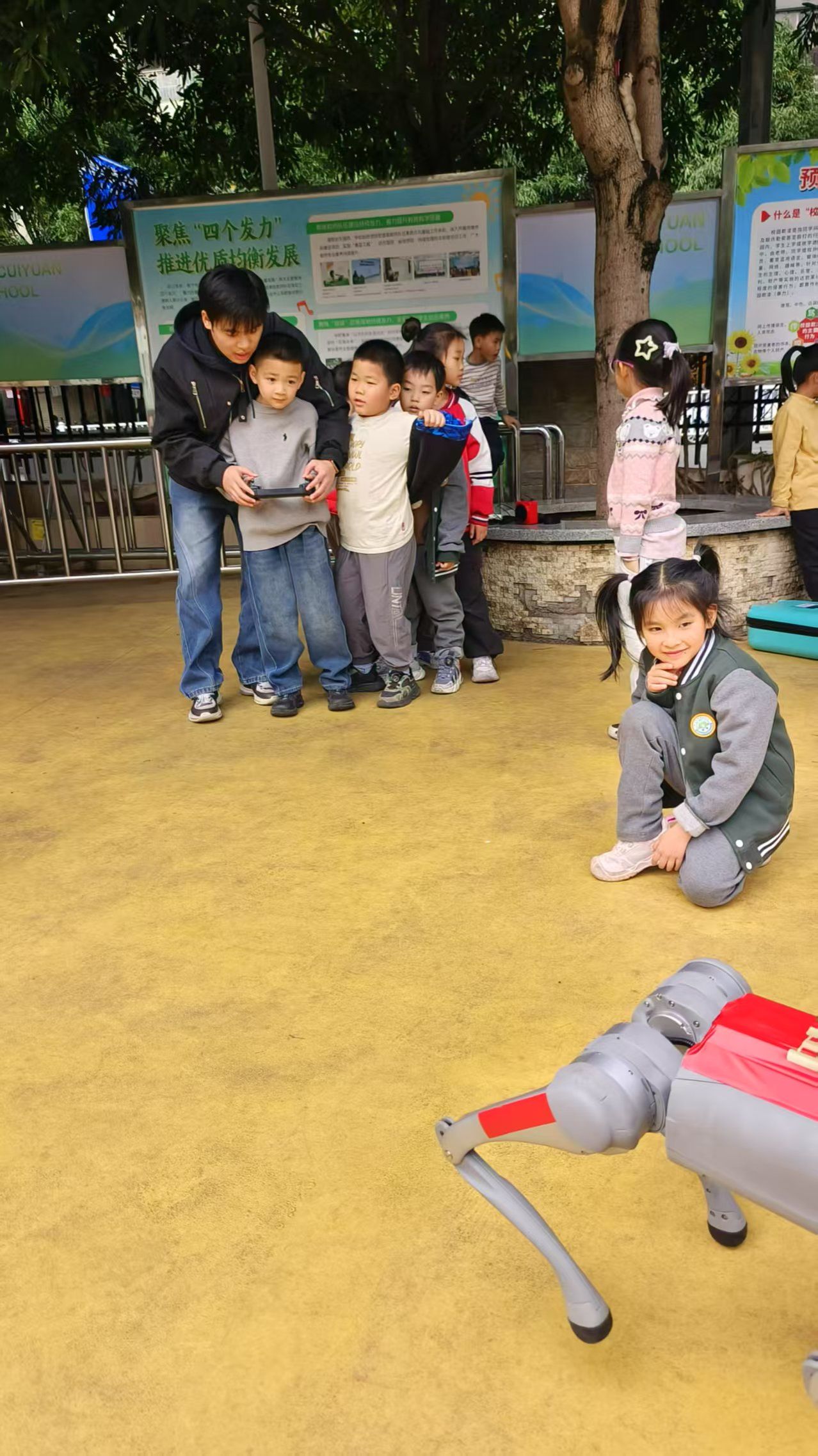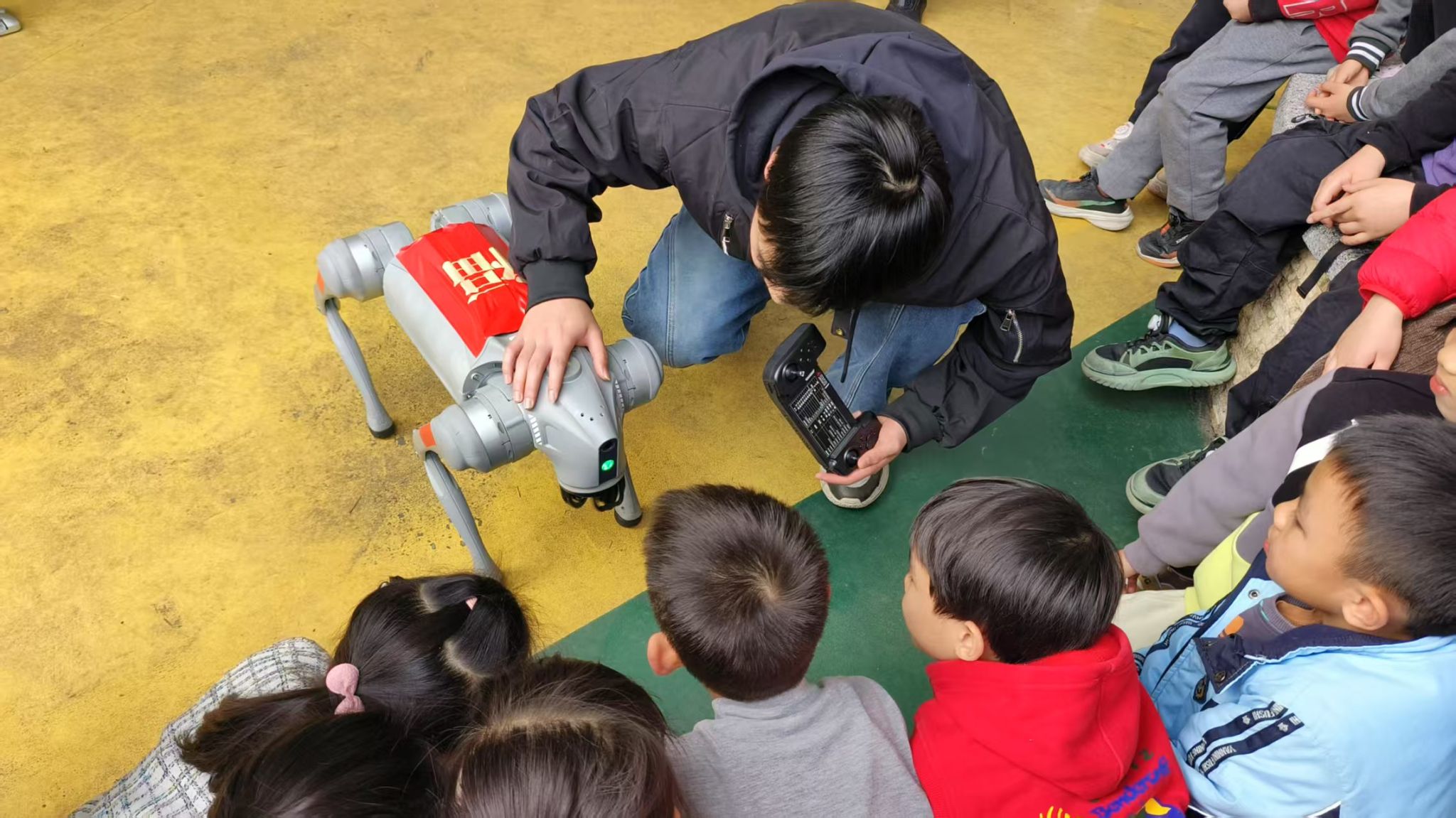 活动中,黄浩杰同学详细地为小朋友们讲解和展示了机器狗的各项功能,从稳步行走、疾速奔跑等基础动作,到后空翻、障碍跳跃等高难度技能,机器狗的精彩表演引得现场惊叹连连。林龙、莫金卫同学用通俗易懂的语言,深入浅出地向小朋友们揭秘机器人和机器狗的运行原理,小朋友们听得津津有味。在最后的互动环节,同学们邀请每一位小朋友都尝试自己操控机器狗,让孩子们在动手间体会人工智能的魅力,兴奋的欢呼声此起彼伏,将活动氛围推向了高潮。