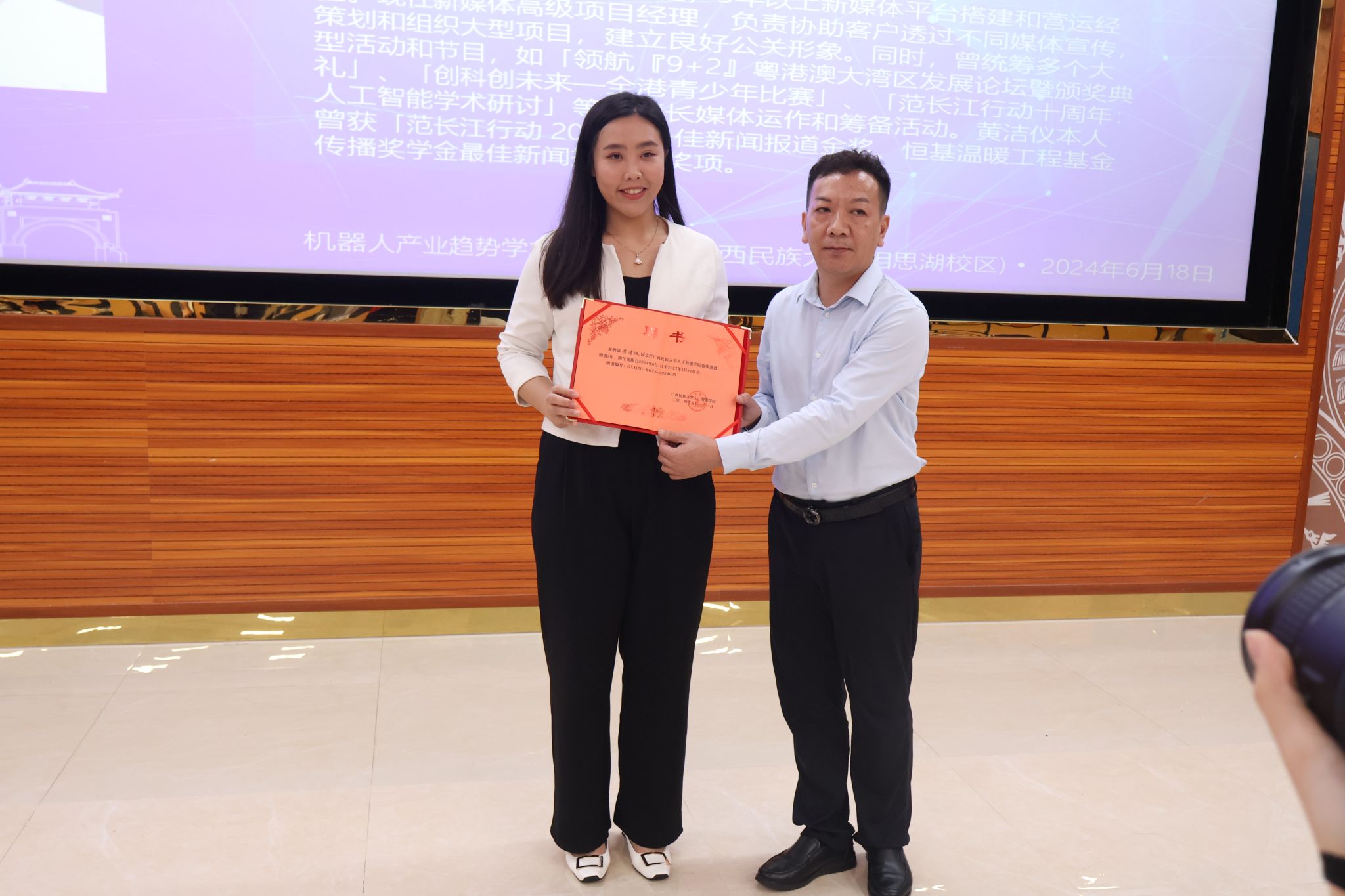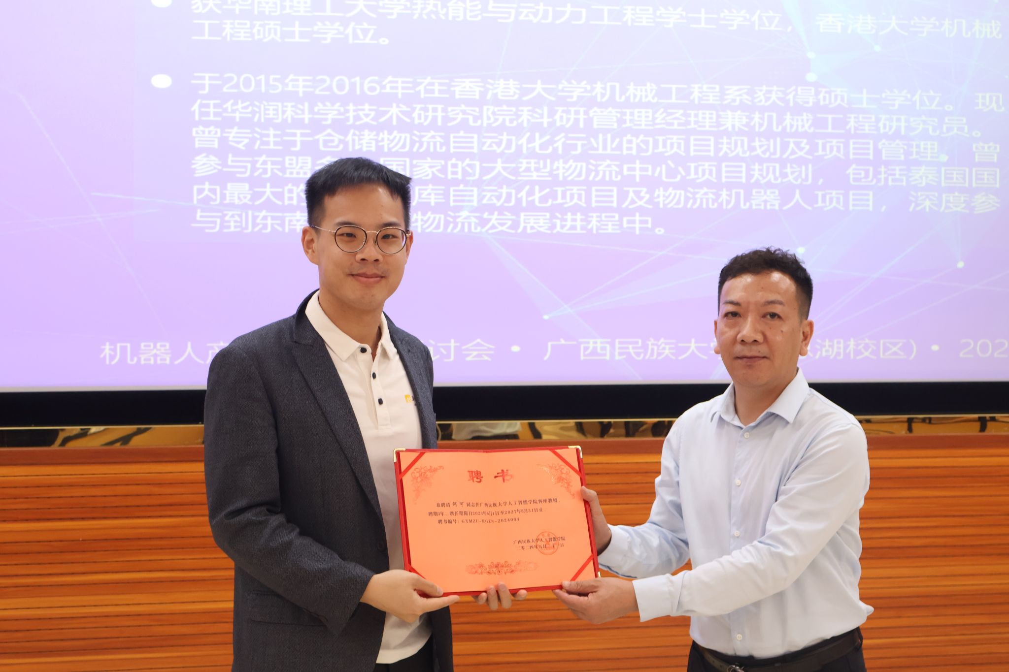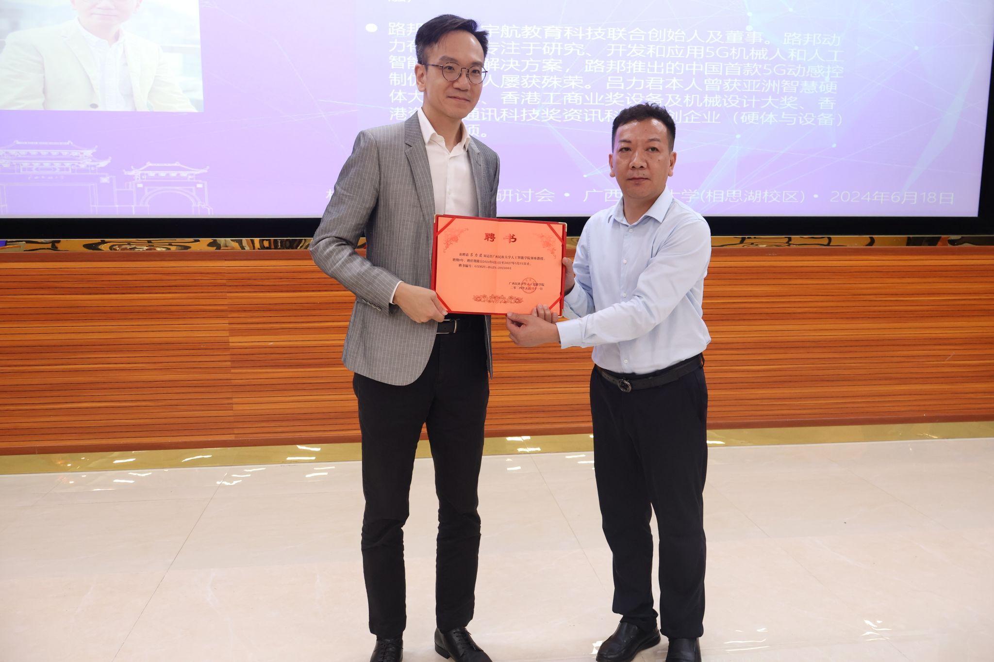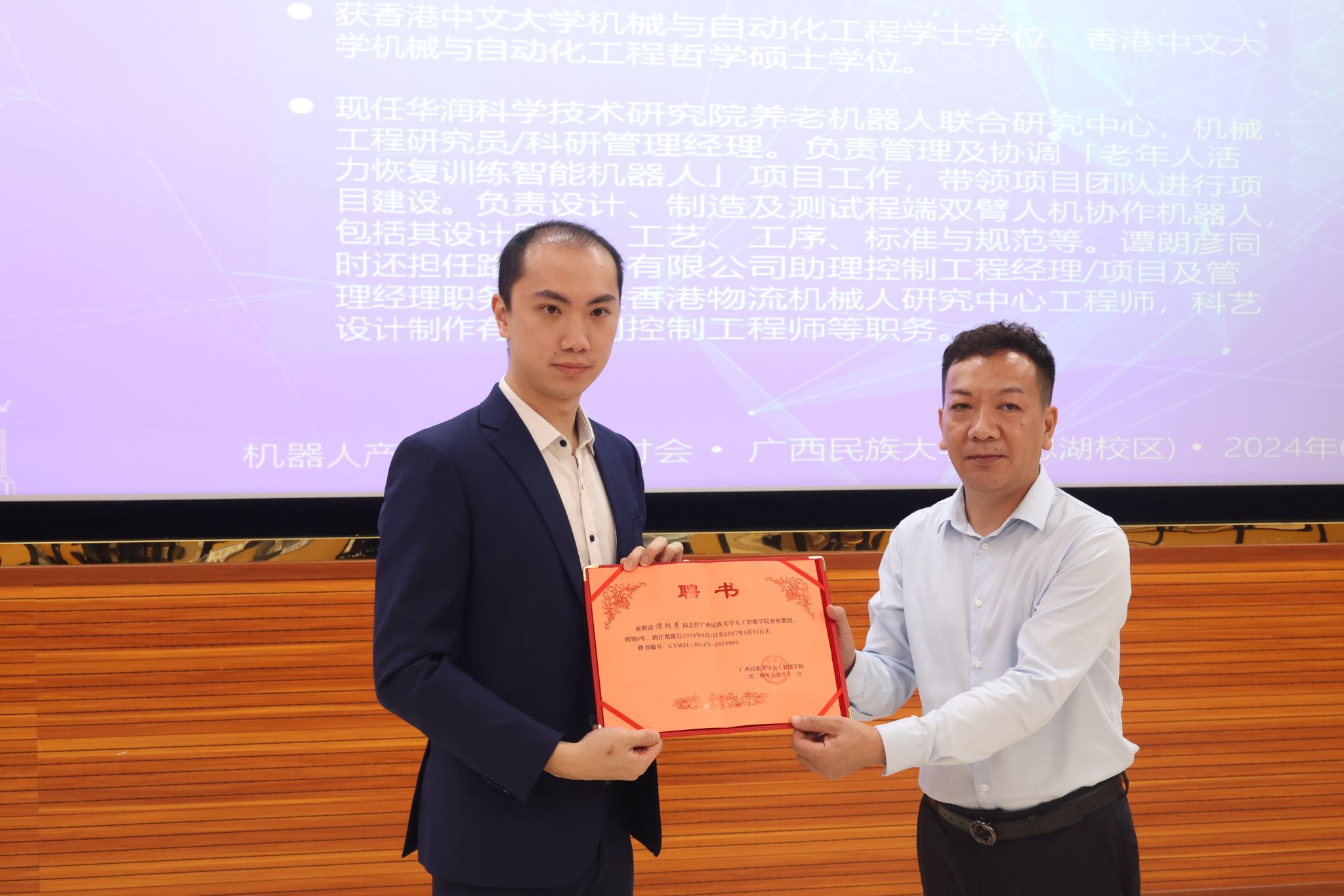 学院副院长莫靖林为谭朗彦颁发客座教授聘请书