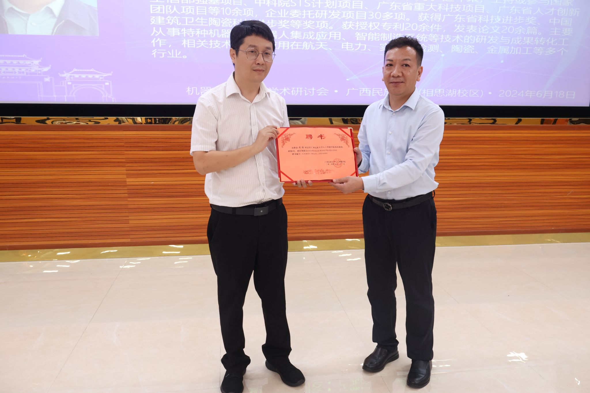学院副院长莫靖林为周谦颁发客座教授聘请书