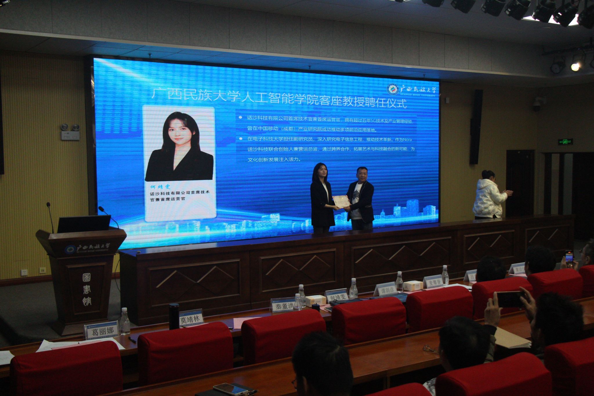 会上,学院举行客座教授聘任仪式。学院副院长莫靖林为何靖雯女士颁发客座教授证书。